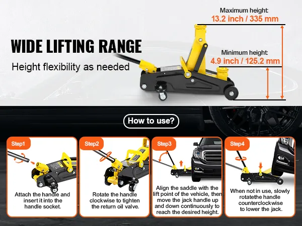 Veelzijdige hefhoogte: Met een minimale hefhoogte van 4,9 inch (125,2 mm) en een maximale hefhoogte van 13,2 inch (335 mm) biedt deze krik met laag profiel een groot hefbereik. De hydraulische pomp met enkele zuiger biedt voldoende hoogte om de meeste voertuigen op te tillen voor taken zoals het vervangen van banden, inspectie/reparatie van het remsysteem, vervanging van het uitlaatsysteem en andere chassisgerelateerde onderhoudstaken. Door de hefhendel voorzichtig tegen de klok in te draaien, wordt het voertuig voorzichtig neergelaten.