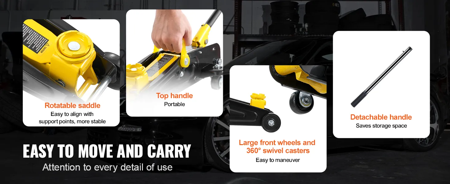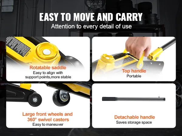 Uitgerust met een groot zadel om het voertuig te beschermen; Dankzij een handgreep aan de bovenkant, grote voorwielen en zwenkwielen kan de krik snel en gemakkelijk worden verplaatst en getransporteerd; het handvat is afneembaar voor eenvoudig opbergen.