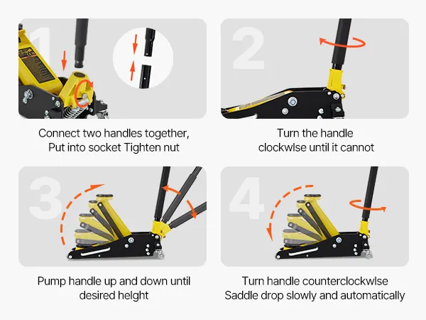 Hefbereik van 100-545 mm: Onze vlakke vloerkrik biedt een minimale hefhoogte van 100 mm en een maximale hefhoogte van 545 mm. Hij tilt sedans gemakkelijk op en biedt voldoende bodemvrijheid. Om de krik te laten zakken, draait u de hendel tegen de klok in voor een soepele daalbeweging.