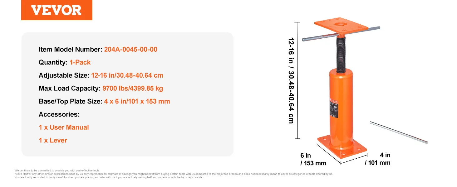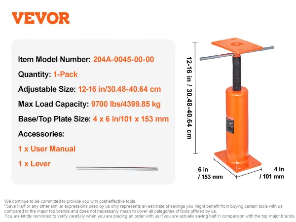 Adjustable Height Design: Need flexibility? This basement floor jack features an adjustable height design. It adjusts from 12 to 16 in/30.48 to 40.64 cm, so you can find the perfect height for your needs.