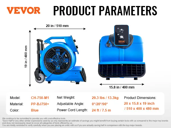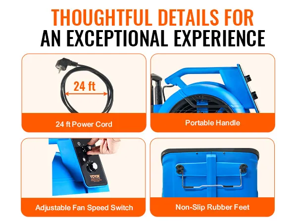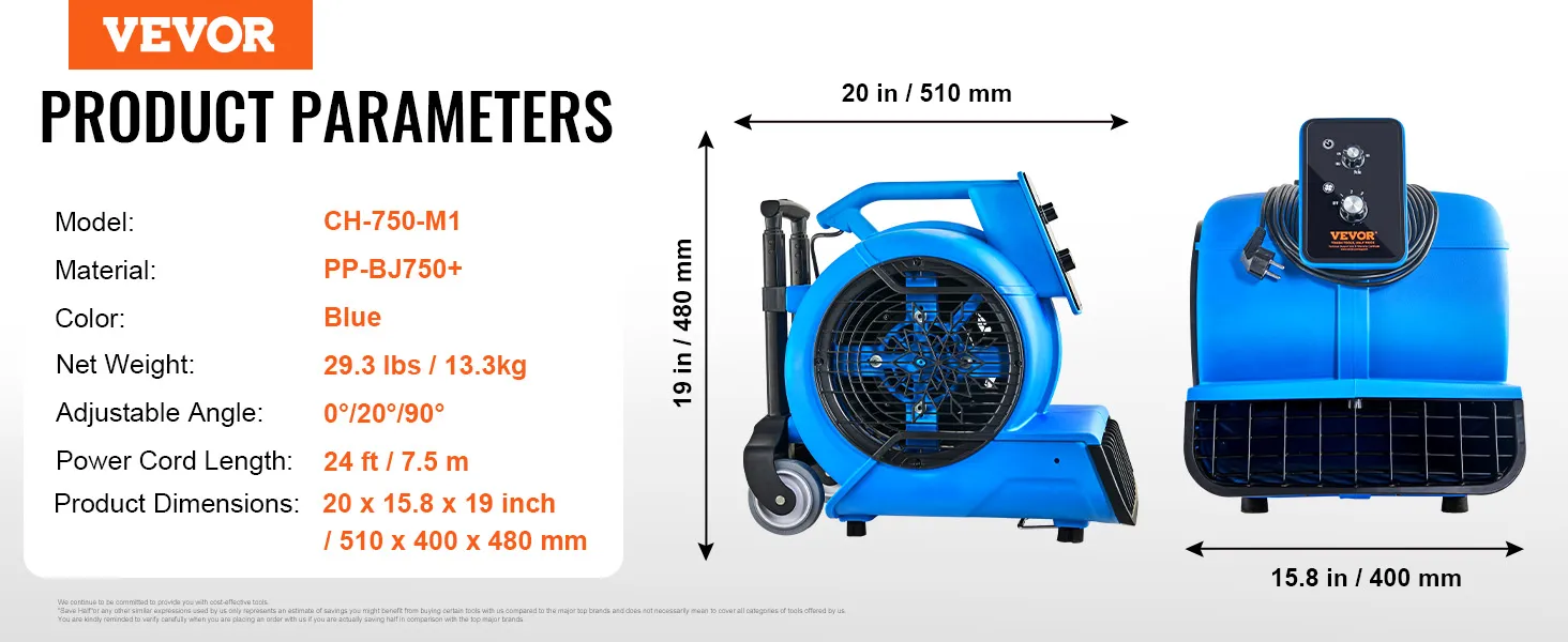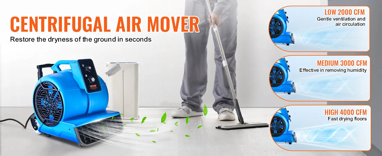 Rapidly restore the ground dry, remove moisture and dampness, the floor blower helps you to solve all kinds of problems. 3 adjustable speeds to suit different needs; Long power cord, portable handle, wind speed switch, non-slip rubber feet, thoughtful design, easy to use.