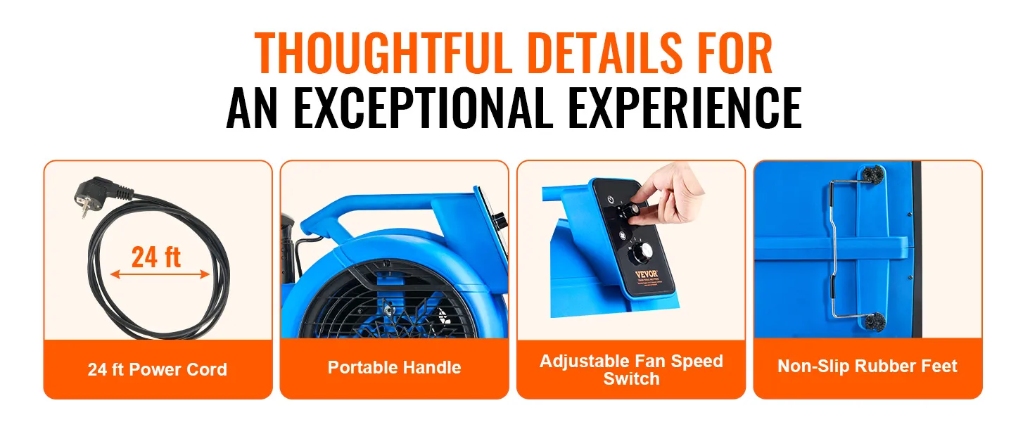 Real Space-saver: The blower fan comes with a 24 ft power cord, making it easy to move around the room with just one hand. You no longer have to worry about losing space. It is optimal for drying flat surfaces and tight areas.