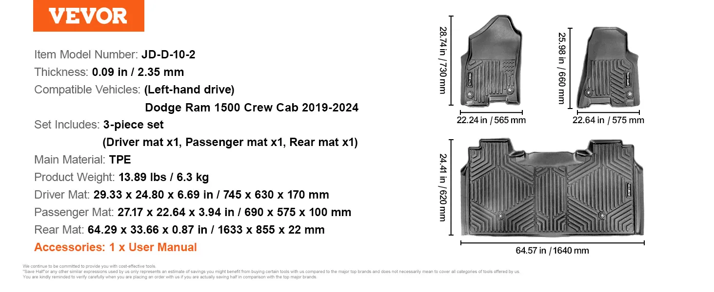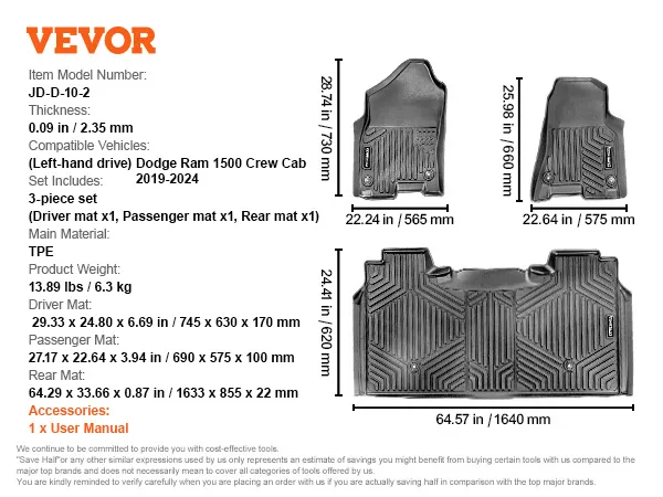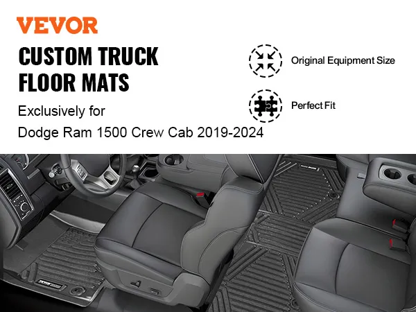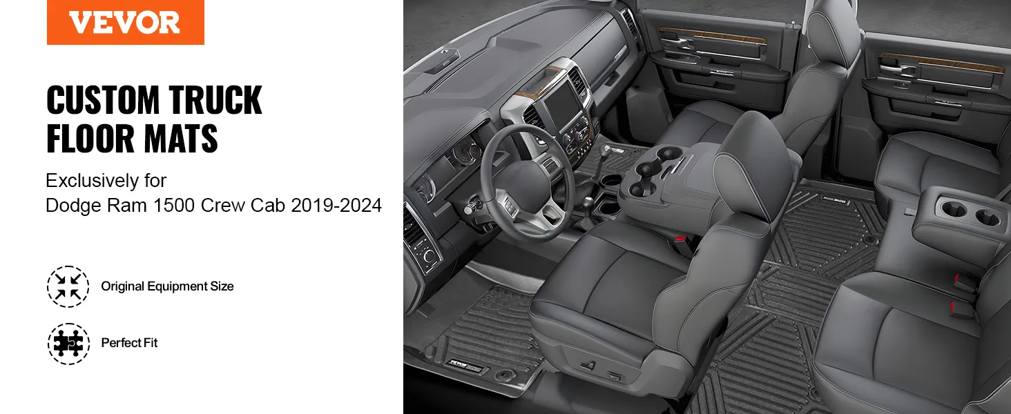 Vehicle Fitment: VEVOR automotive floor mats fully cover your vehicle's floors, protecting against mud, sand, water stains, snack crumbs, and other debris from dirtying the original carpet. They are compatible with Dodge Ram 1500 Crew Cab 2019-2024. Please check your vehicle's model and year before purchasing.
