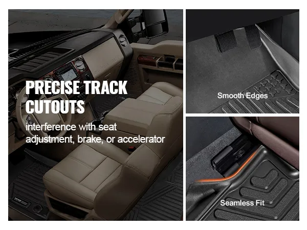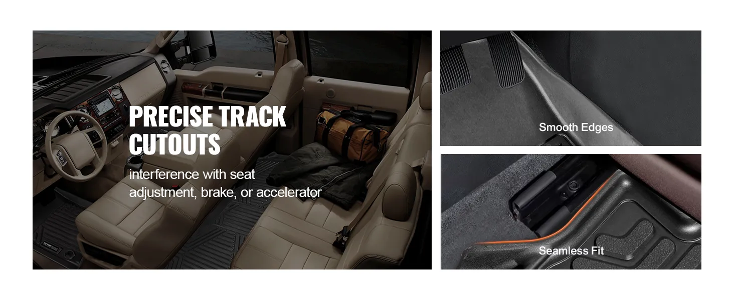 These front & 2nd row liners are perfectly aligned with your vehicle's structure, leaving precise track cutouts that won't interfere with seat adjustments. They do not obstruct the brake or gas pedals, providing a secure driving experience.