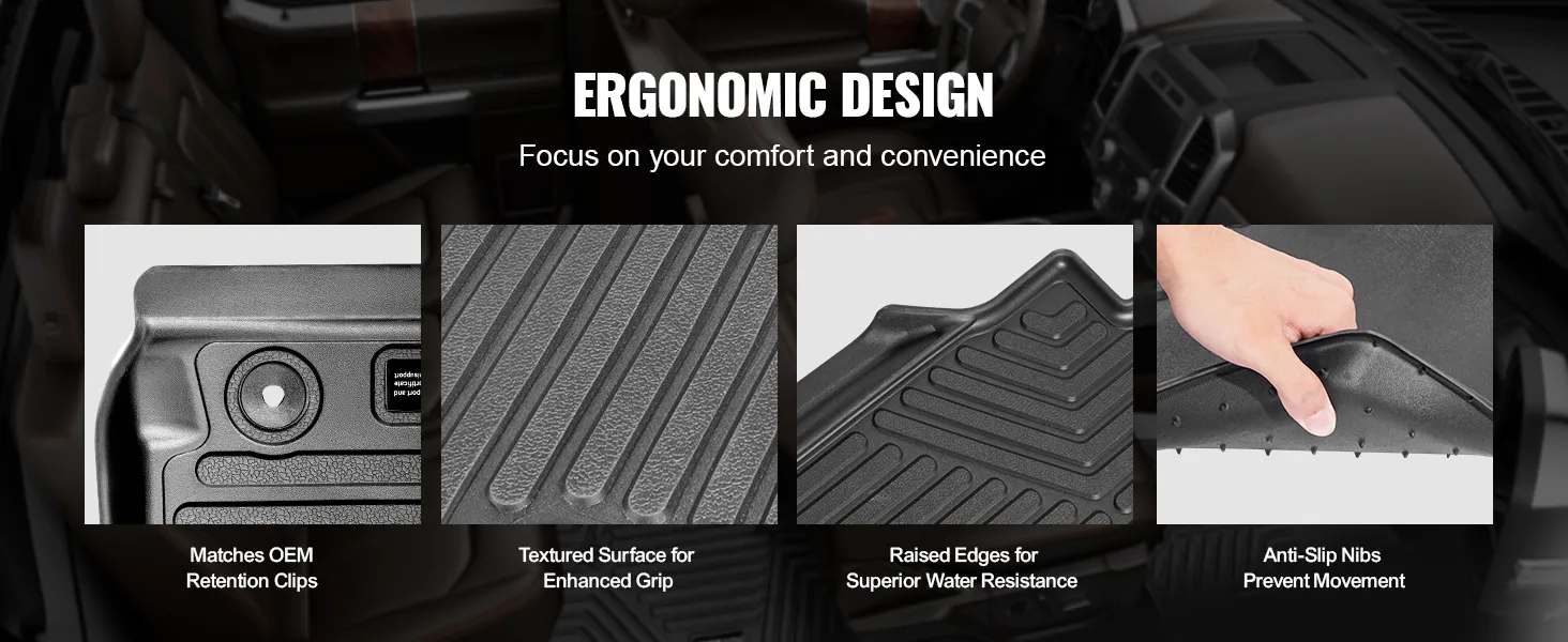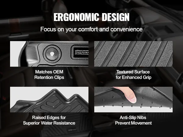 Non-Slip & Waterproof: Our floor liners are equipped with fasteners for enhanced anti-slip protection, preventing the mats from shifting. The bottom features anti-slip pins to further secure the mats. Raised edges provide superior waterproofing, effectively blocking rain, mud, or snow from seeping into the carpet.