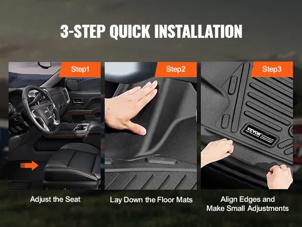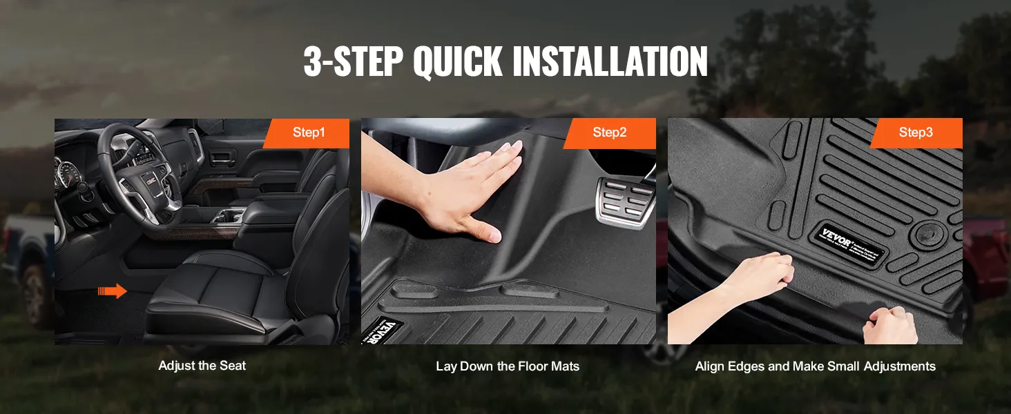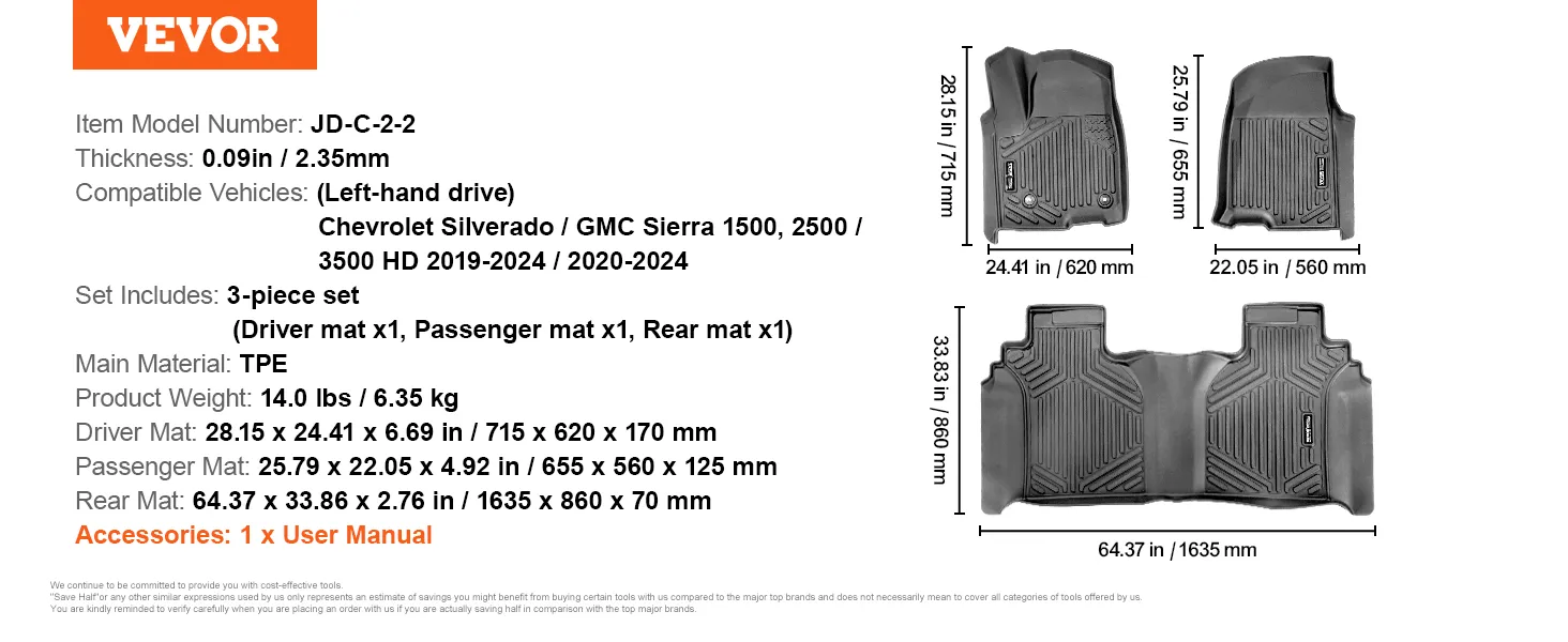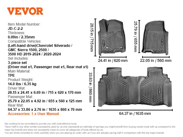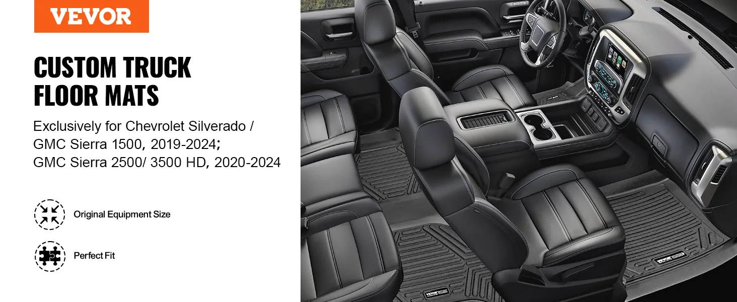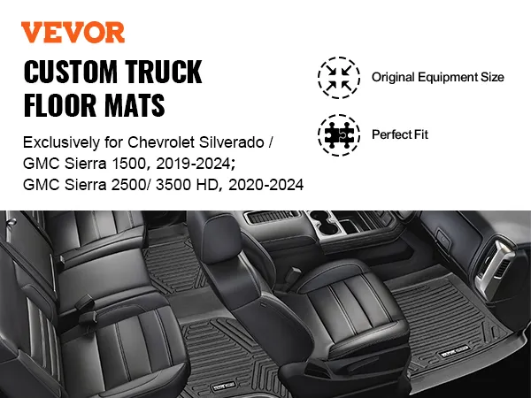 Voertuiguitrusting: VEVOR-autovloermatten bedekken de vloer van uw voertuig volledig en beschermen tegen modder, zand, watervlekken, snackkruimels en ander vuil dat vlekken op het originele tapijt veroorzaakt. Ze zijn compatibel met Chevrolet Silverado / GMC Sierra 1500, 2500 / 3500 HD 2019-2024 / 2020-2024. Controleer vóór aankoop het model en bouwjaar van uw voertuig.