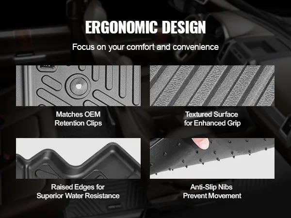 Opstaande randen bieden waterdichte bescherming tegen regen, modder en sneeuw, terwijl antislippinnen ervoor zorgen dat de matten op hun plaats blijven liggen en u zich geen zorgen hoeft te maken.