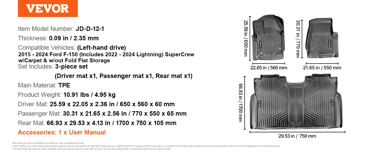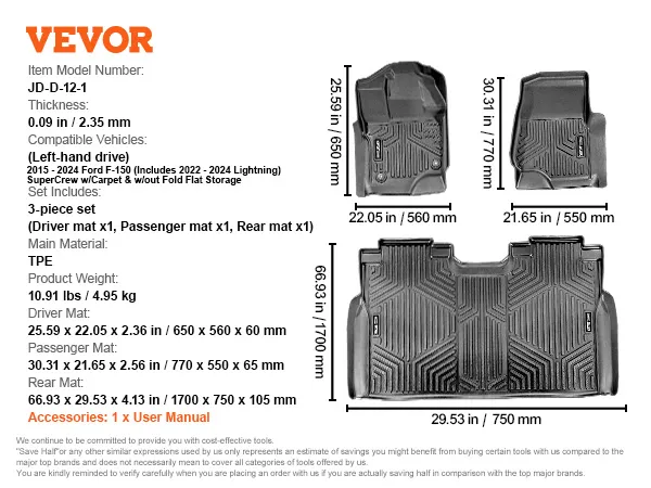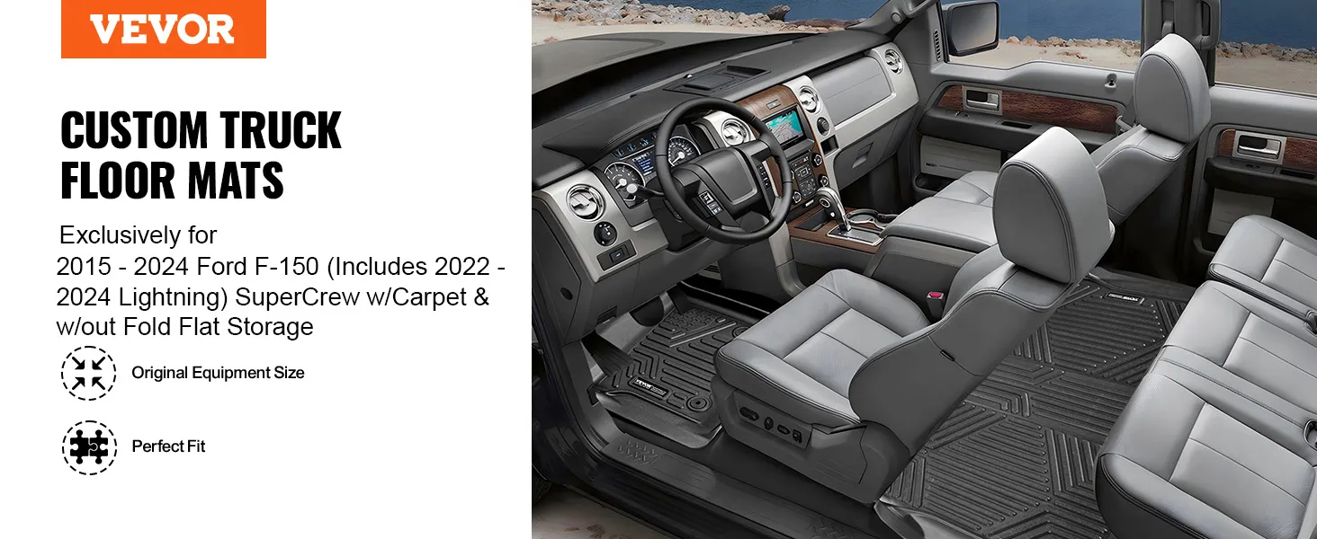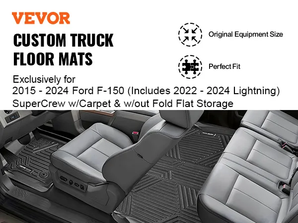 Vehicle Fitment: VEVOR automotive floor mats fully cover your vehicle's floors, protecting against mud, sand, water stains, snack crumbs, and other debris from dirtying the original carpet. They are compatible with 2015-2024 Ford F-150 (Includes 2022-2024 Lightning) SuperCrew with Carpet & Without Fold Flat Storage. Please check your vehicle's model and year before purchasing.