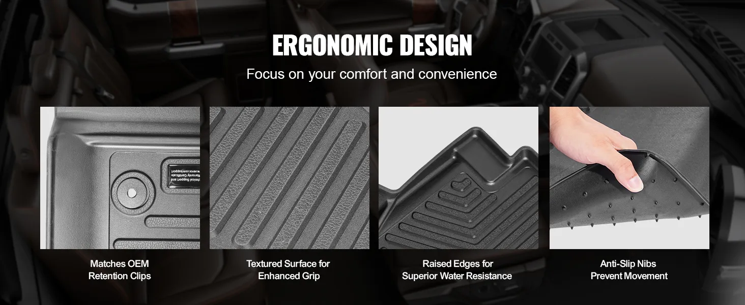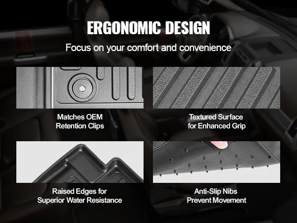 Non-Slip & Waterproof: Our floor liners are equipped with fasteners for enhanced anti-slip protection, preventing the mats from shifting. The bottom features anti-slip pins to further secure the mats. Raised edges provide superior waterproofing, effectively blocking rain, mud, or snow from seeping into the carpet.