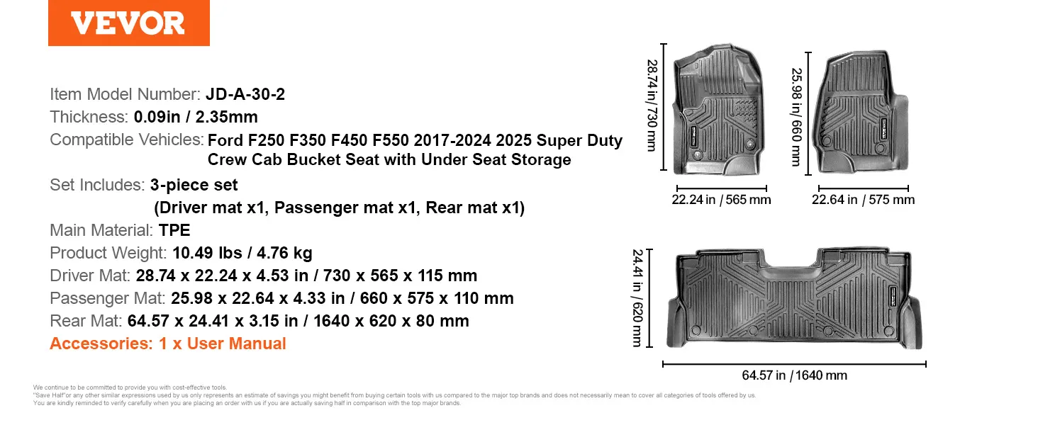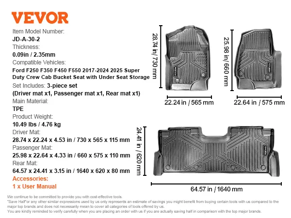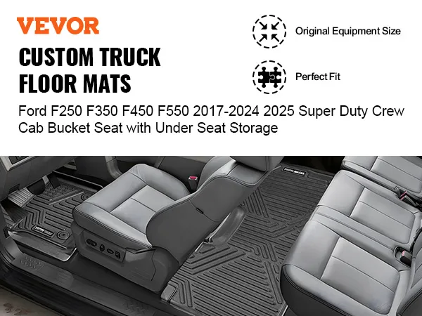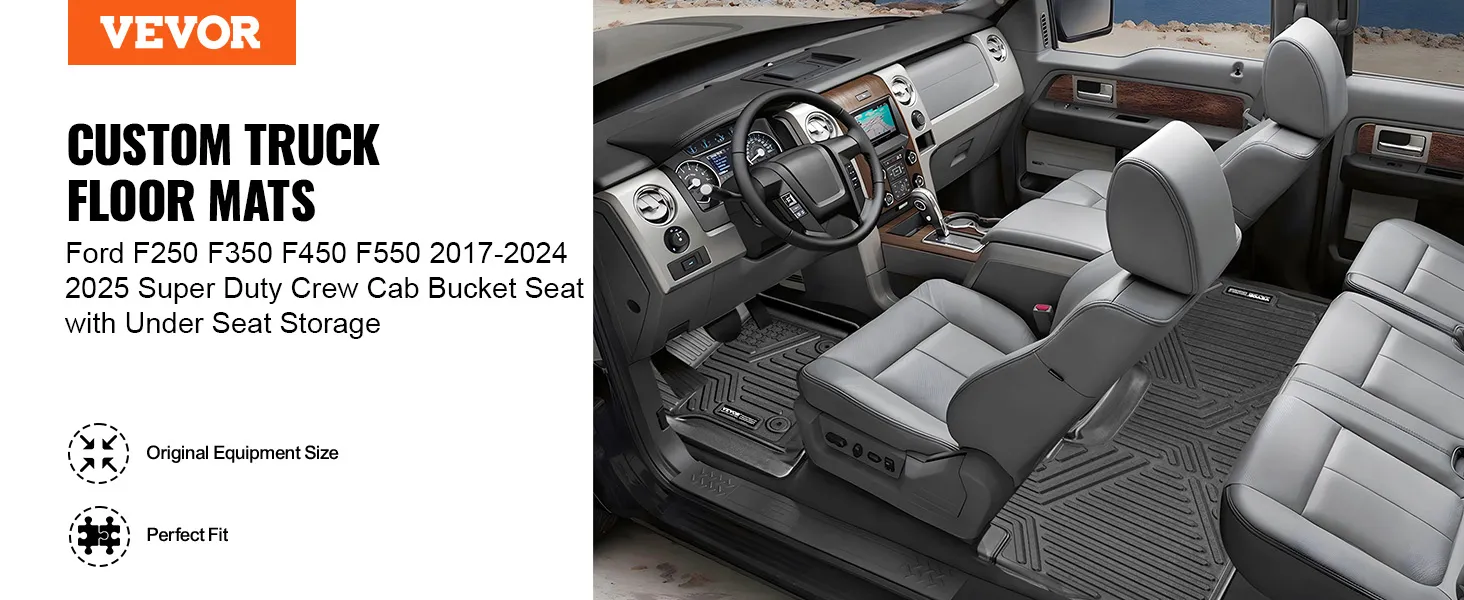 Vehicle Fitment: VEVOR automotive floor mats fully cover your vehicle's floors, protecting against mud, sand, water stains, snack crumbs, and other debris from dirtying the original carpet. They are compatible with Ford F250 F350 F450 F550 2017-2024 2025 Super Duty Crew Cab Bucket Seat with Under Seat Storage. Please check your vehicle's model and year before purchasing.