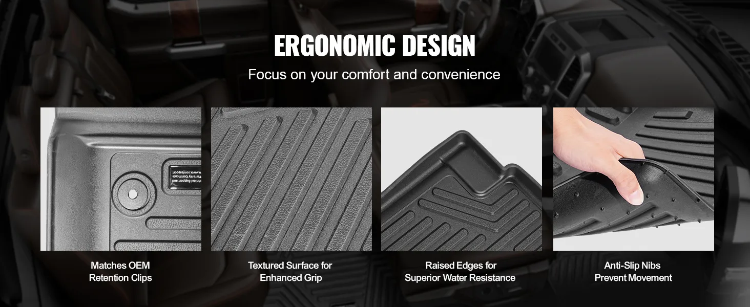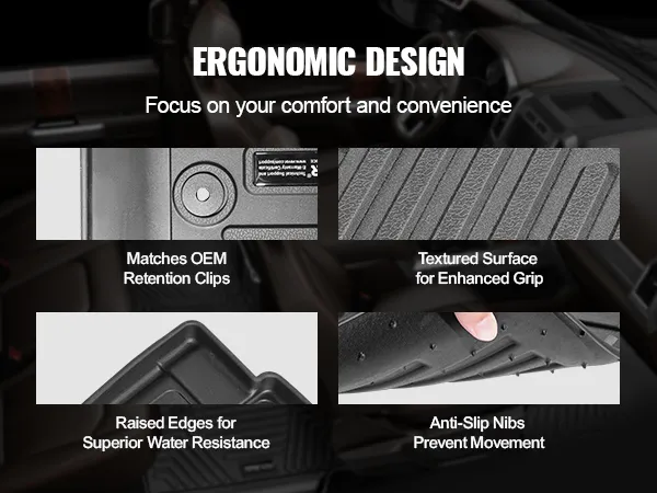 Non-Slip & Waterproof: Our floor liners are equipped with fasteners for enhanced anti-slip protection, preventing the mats from shifting. The bottom features anti-slip pins to further secure the mats. Raised edges provide superior waterproofing, effectively blocking rain, mud, or snow from seeping into the carpet.
