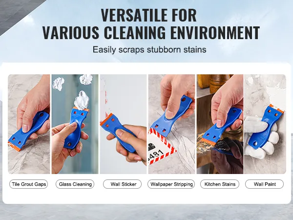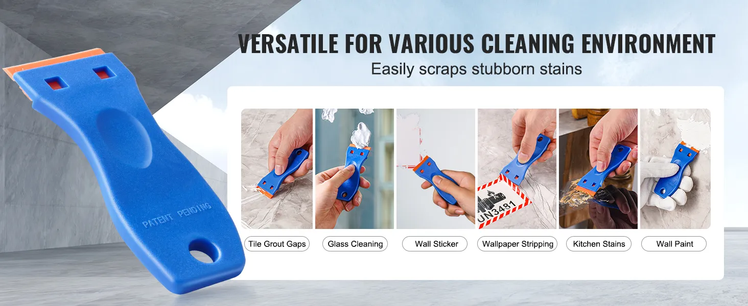 The plastic razor blade scraper is suitable for cleaning kitchen grease and water stains in bathrooms, leveling the ground in construction sites, and cleaning large areas of dirt in commercial places. It is a practical tool for you in various scenarios.