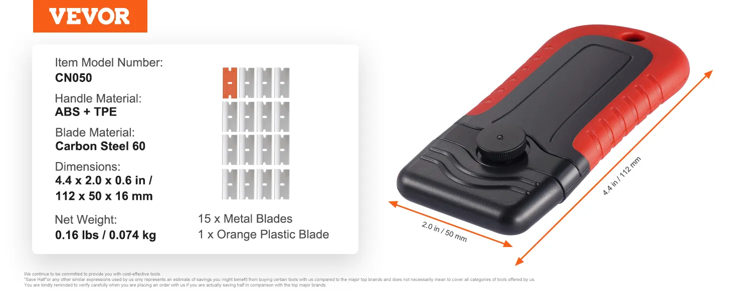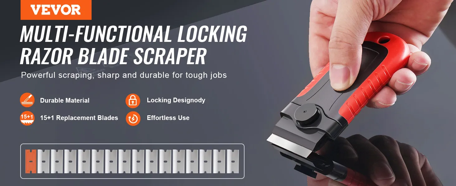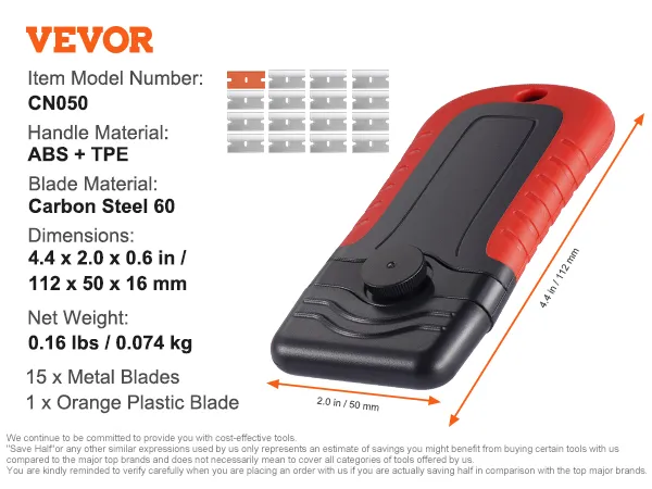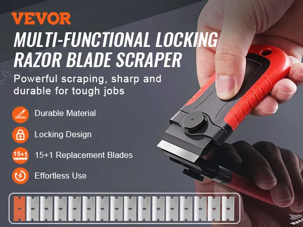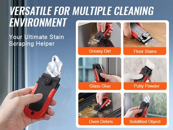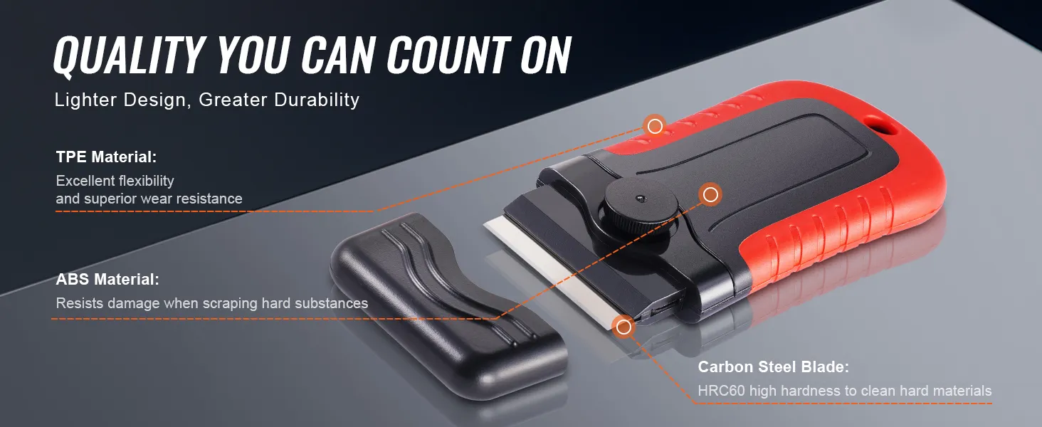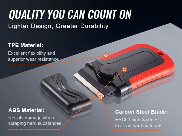 Hoge duurzaamheid en duurzaamheid: onze scheermesschraper is gemaakt van koolstofstaal met een hardheid van HRC60 en is ontworpen om lang mee te gaan. De robuuste ABS-behuizing en TPE-handgreep pakken moeiteloos metalen, glas- en betonoppervlakken aan, waardoor moeilijke schoonmaakklussen een fluitje van een cent worden!