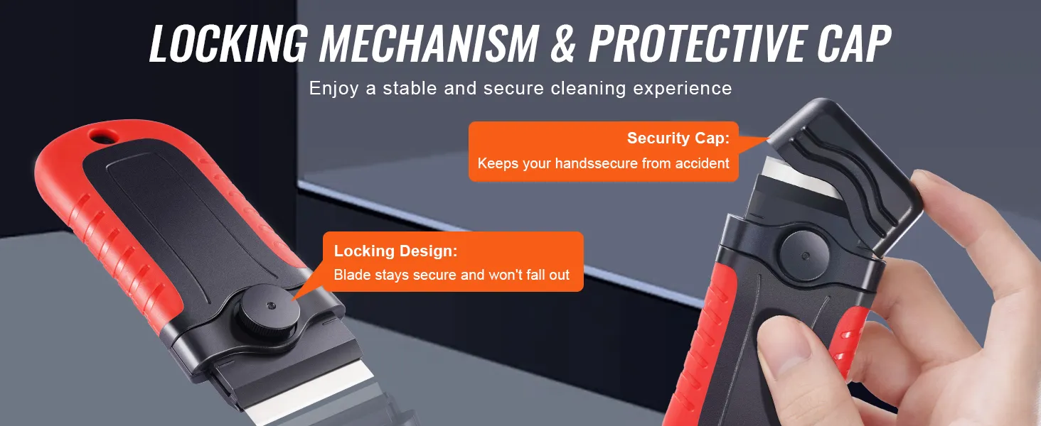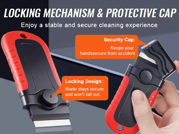 Ons mesje wordt vergrendeld met een schroef, wat de stabiliteit met 80% verhoogt in vergelijking met een scheermesjesschraper met duwmechanisme. De veiligheidsdop beschermt je handen na gebruik.
