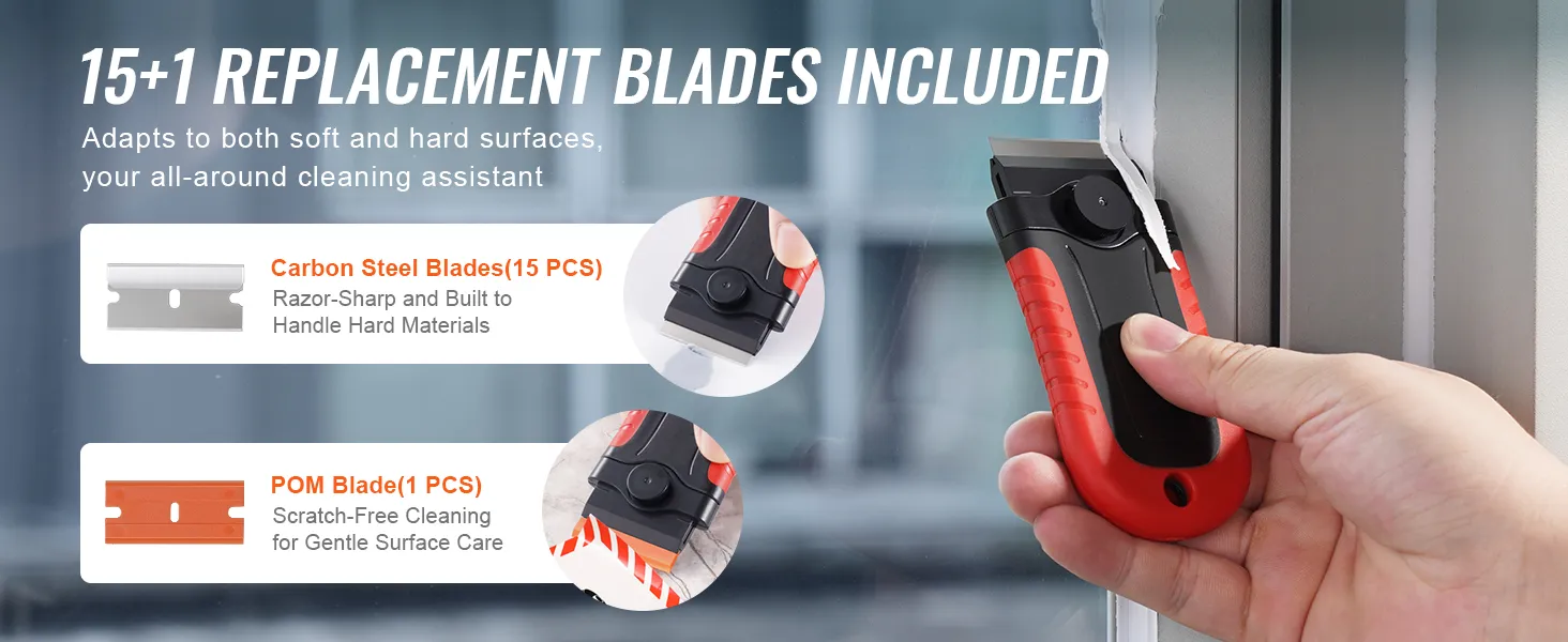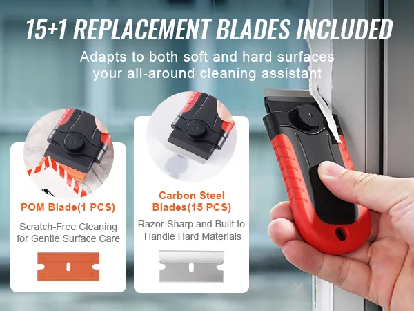 15+1 mesvervanging: onze scheermesschraper wordt geleverd met 15 koolstofstalen messen en 1 POM-mes, ideaal voor het verwijderen van hardnekkige vuilvlekken van harde oppervlakken. Het vervangende plastic mes is ideaal voor het krasvrij verwijderen van zelfklevende etiketten van harde en zachte oppervlakken.