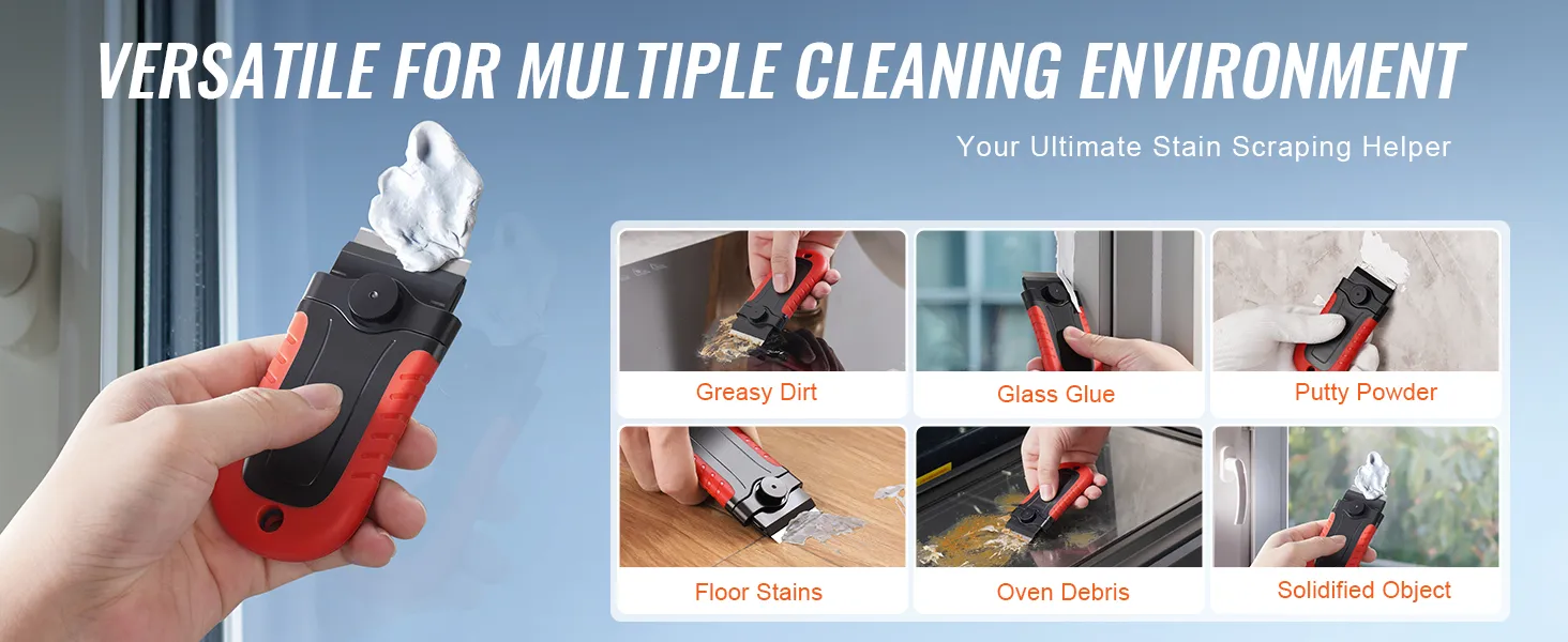 Met zijn ABS+TPE-handgreep en zeer harde messen ligt hij goed in de hand en is hij een goede hulp. Met zijn vergrendelende ontwerp, 15 koolstofstalen messen en 1 POM-vervangmesje reinigt hij moeiteloos zachte en harde oppervlakken, zelfs op moeilijk bereikbare plaatsen!
