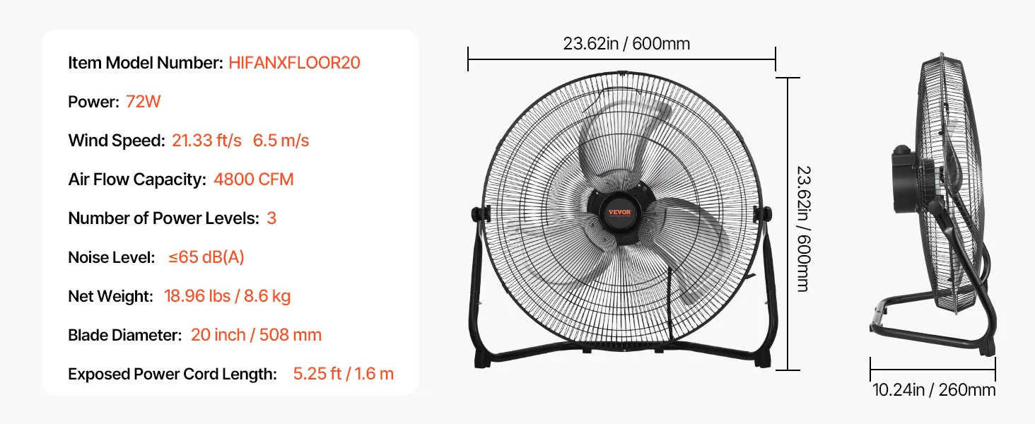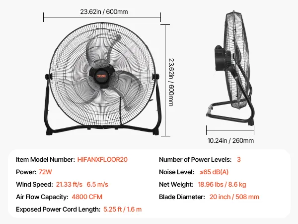 This high-speed industrial floor fan offers 4800 CFM airflow and 22.97 ft air throw. With ≤65 dB(A) noise, it delivers white-noise cooling. Featuring 20-in aluminum blades and a rust-proof grill, it has a 360° adjustable tilt, a built-in handle, and a wall-mount design, ideal for all occasions.