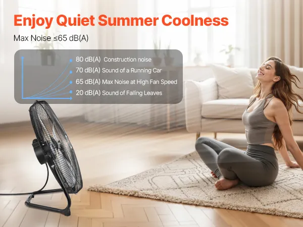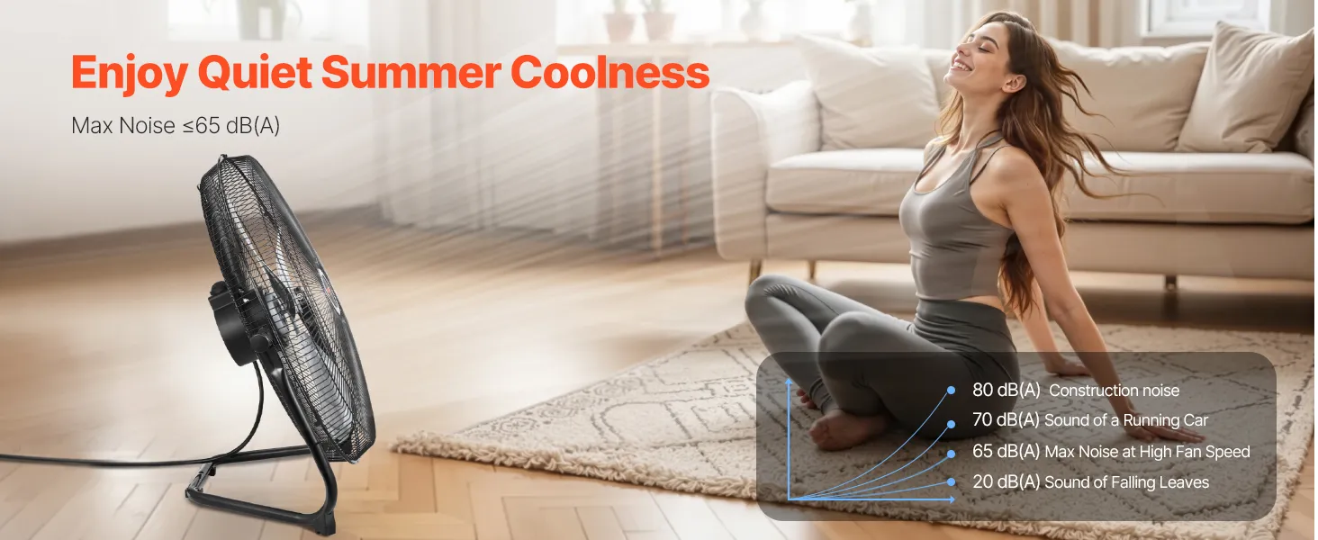 High-Speed, Low Noise: Our high velocity floor fan features a 3-speed dual ball-bearing motor, delivering up to 4800 CFM airflow with an outstanding air throw of 22.97 ft and remarkable wind speed at 21.33 ft/s. Besides, the max noise is below 65 dB(A), ideal for rapid but not loud cooling.