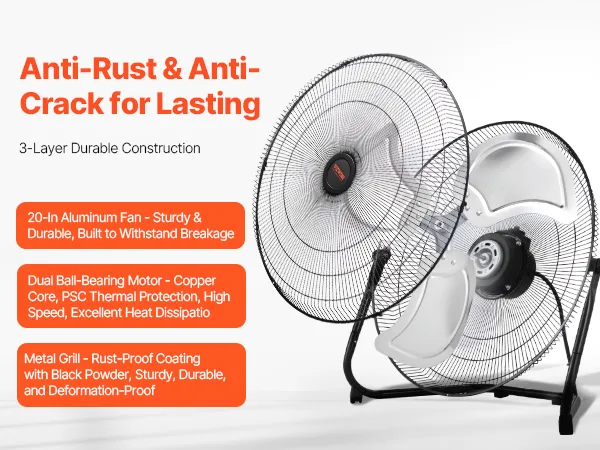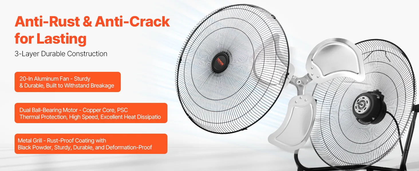 The heavy duty industrial fan has a metal grill with black powder-coat finish for rust-proof and durability. The 20-inch large aluminum blades are strong, bending-proof, and built to last. The high-quality dual ball-bearing motor and PSC thermal protection ensure secure and reliable long-term use.