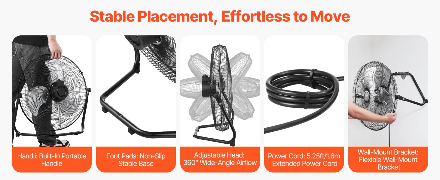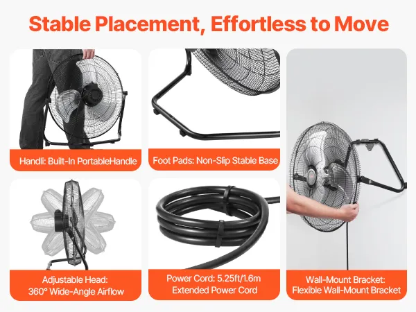 Our adjustable commercial fan includes a wall-mount bracket for easy installation and a built-in handle for portability. The base's non-slip rubber feet ensure stability, while the swivel mechanism provides 360° vertical airflow. The 5.25 ft extended power cord offers flexible wiring options.