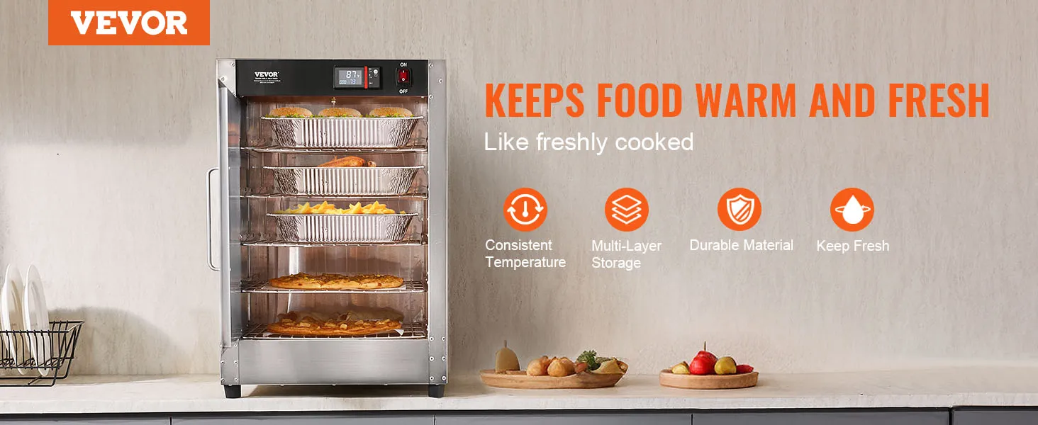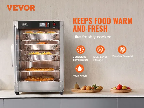 Langdurig warm houden: de commerciële voedselverwarmingskast heeft een instelbaar temperatuurbereik van 26 tot 80 °C (80℉ tot 177℉) met snelle verwarming en langdurige warmte. Real-time temperatuurbewaking en eenvoudige bediening maken het perfect voor het bewaren van heerlijk, sappig gekookt vlees, noedels, knapperig gefrituurd voedsel, gefermenteerde yoghurt en gedroogd fruit en groenten.