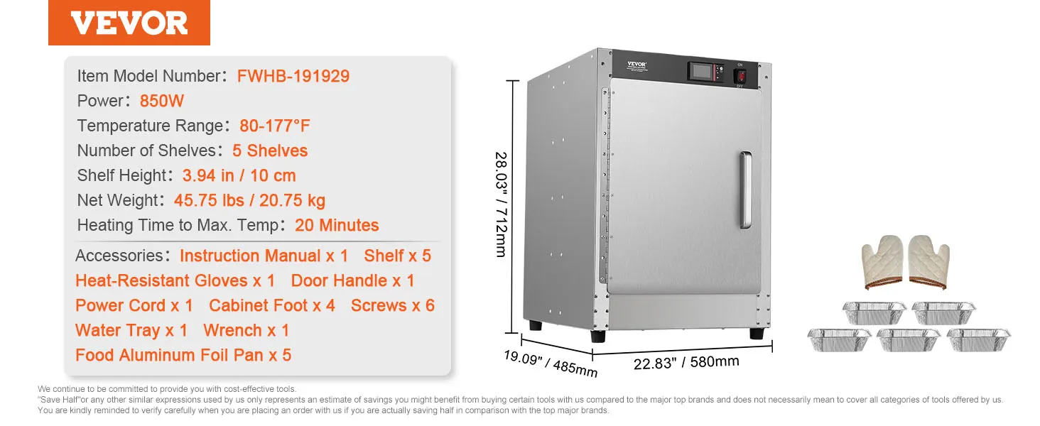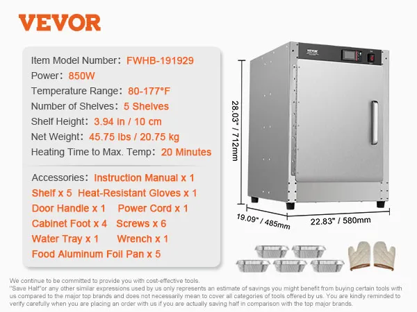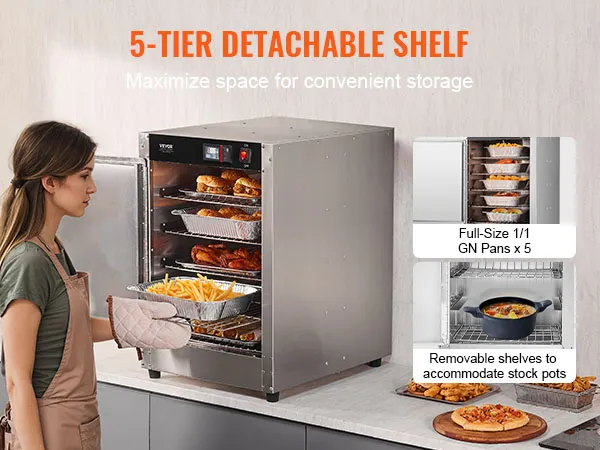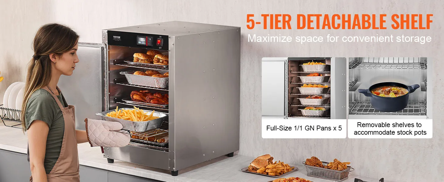 Spacious Multi-Tier Design: This food warmer cabinet includes 5 spacious shelves with a height of 3.94"/10cm, and can each hold one full-size 1/1 GN pan. The shelves are durable and suitable for various food trays, with the flexibility to be removed for taller items.