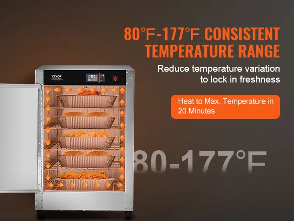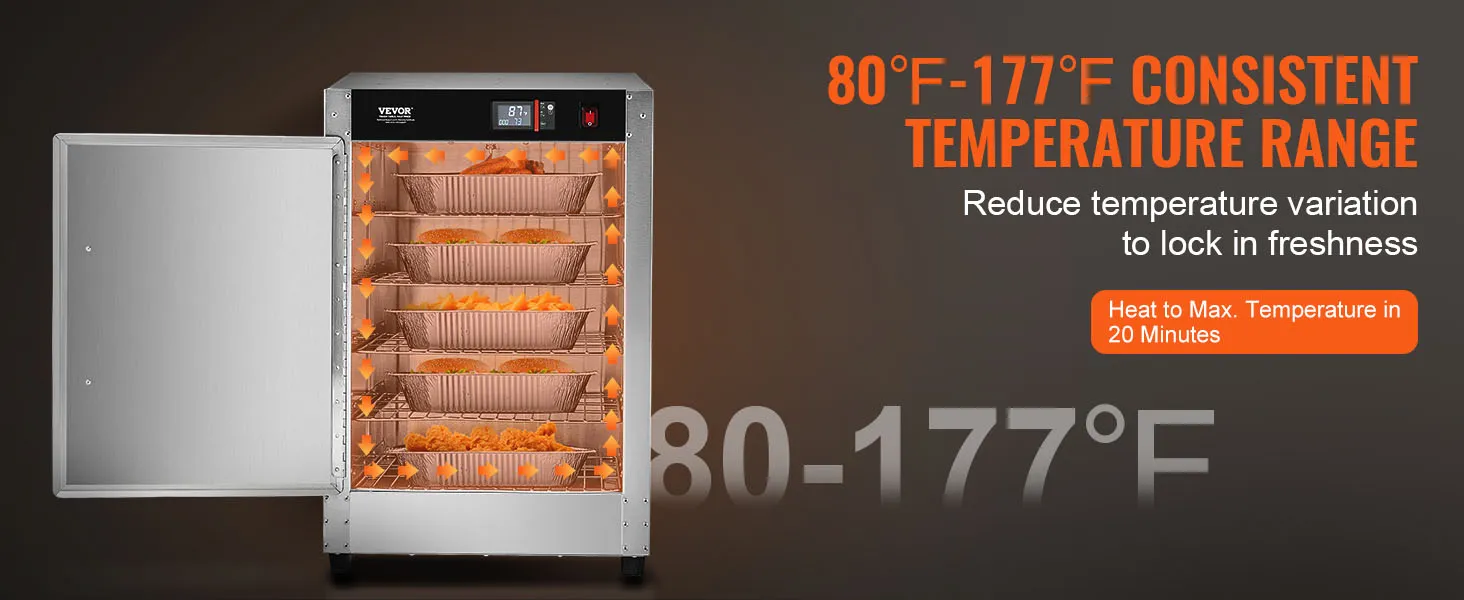 Keep Warm for a Long Time: The commercial hot box food warmer cabinet features an adjustable temperature range of 80℉-177℉ with rapid heating and long-lasting warmth. Real-time temperature tracking and simple operation make it perfect for storing delicious, juicy cooked meats, pasta, crispy fried foods, fermented yogurt, and dried fruits and vegetables.
