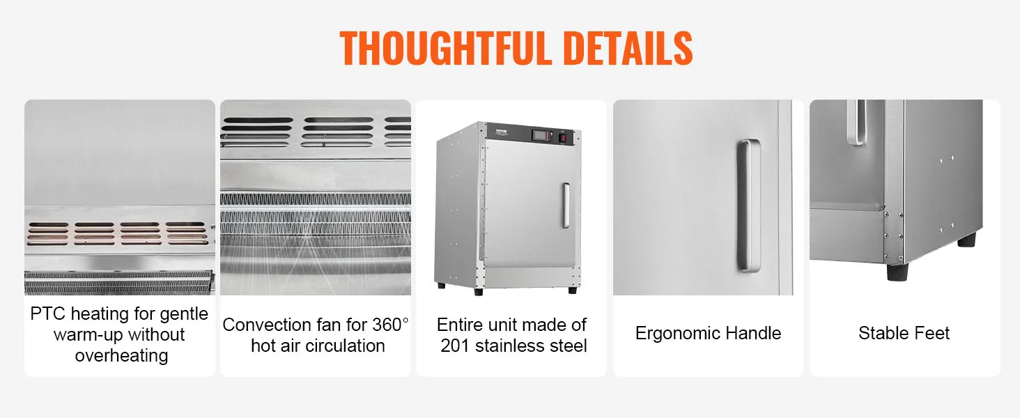 Prevents Food Drying Out: PTC heating provides stable temperature control. The 360° hot air circulation ensures even warmth, while the dual-purpose water tray prevents food from hardening or burning. Your dishes retain their original flavor and texture from kitchen to table with our food warmer.
