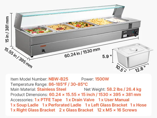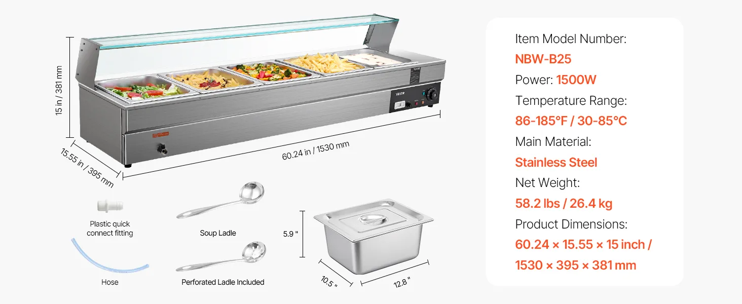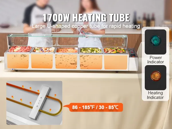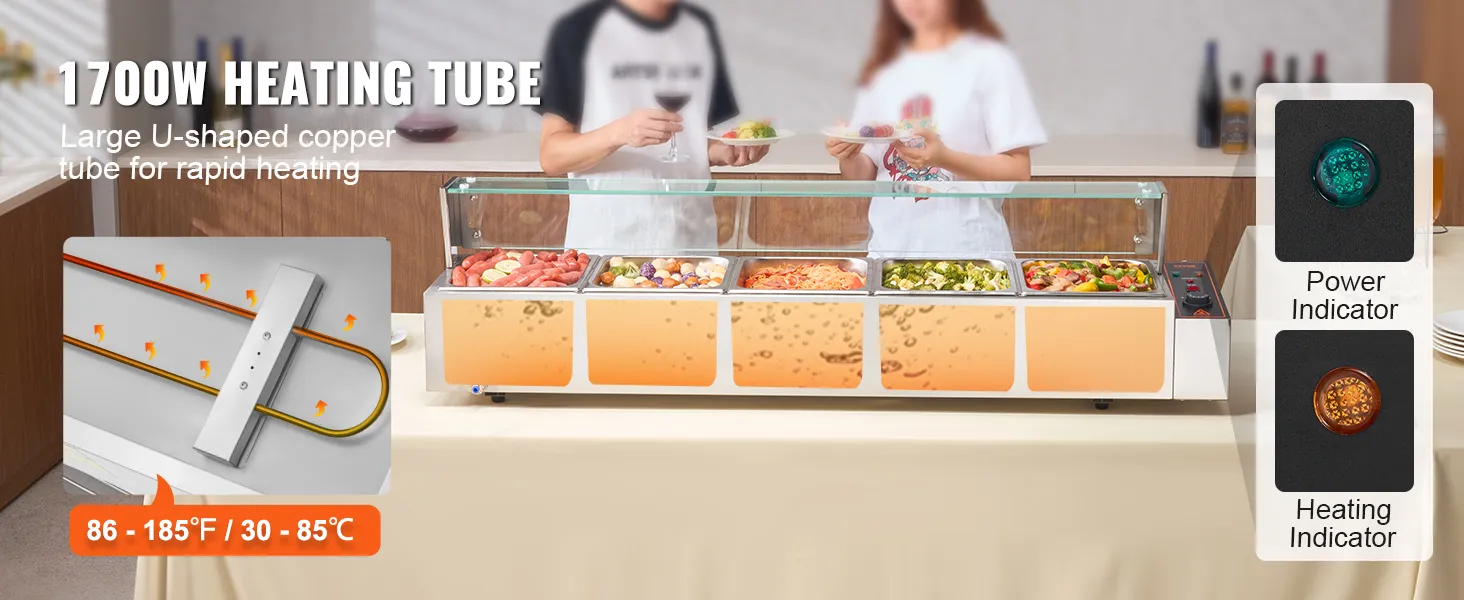 Rust-resistant, Durable: Constructed entirely from stainless steel, this marie buffet offers superior durability. The 1500W stainless steel 304 U-shaped heating tube heats quickly and evenly, maintaining warmth and reducing the risk of rusting