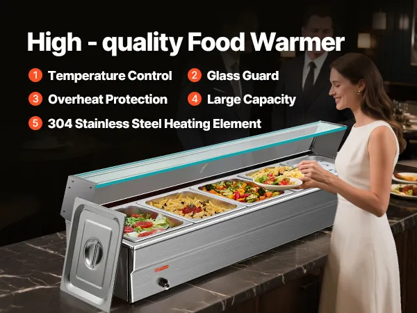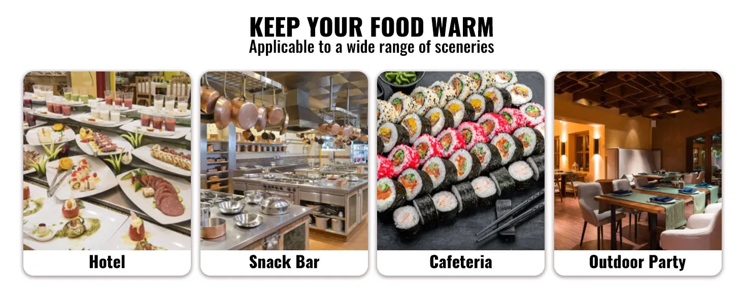 This commercial food warmer is your perfect food guardian, keeping dishes warm at family gatherings or parties. It ensures your food stays perfectly warm and ready to delight your taste buds at any time, creating an unforgettable dining experience.