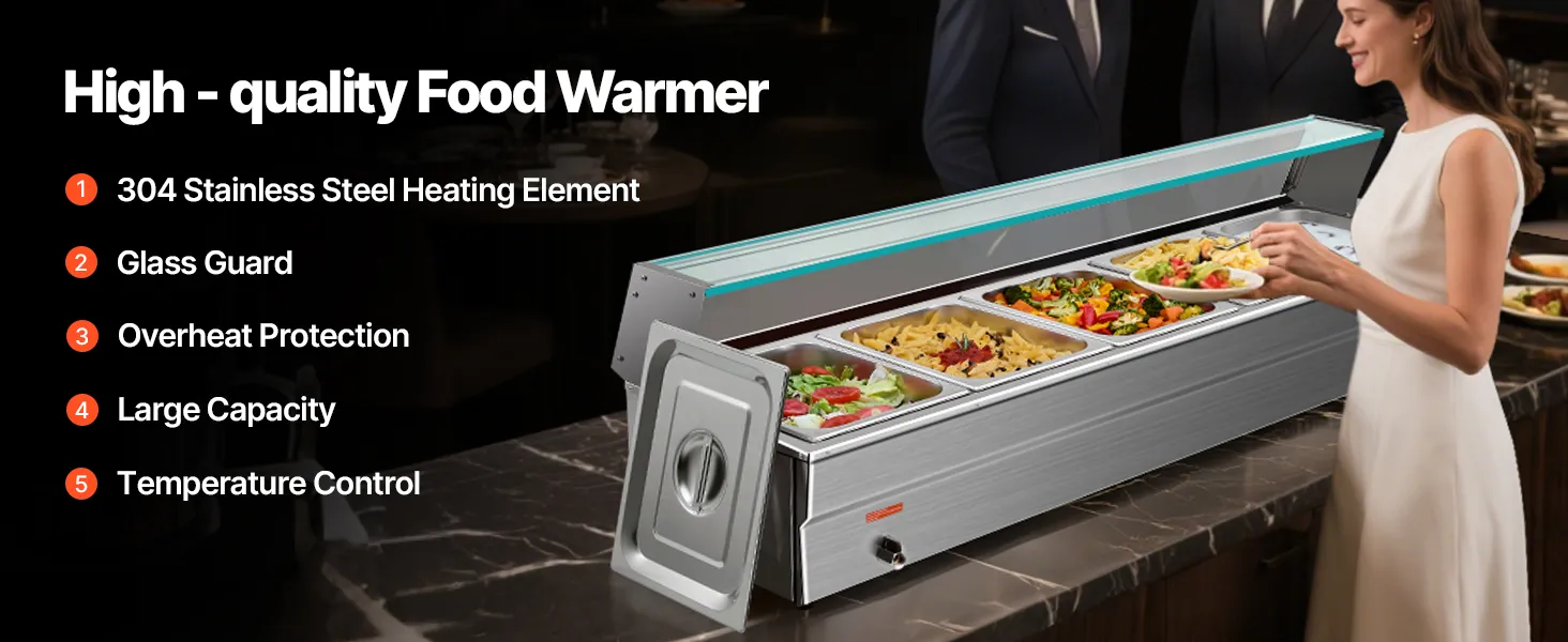 Glass Cover: Equipped with a glass guard, this steam warmer enhances food display while preventing dust and splashes. The sturdy, scratch-resistant glass structure is easy to install, clean, and maintain