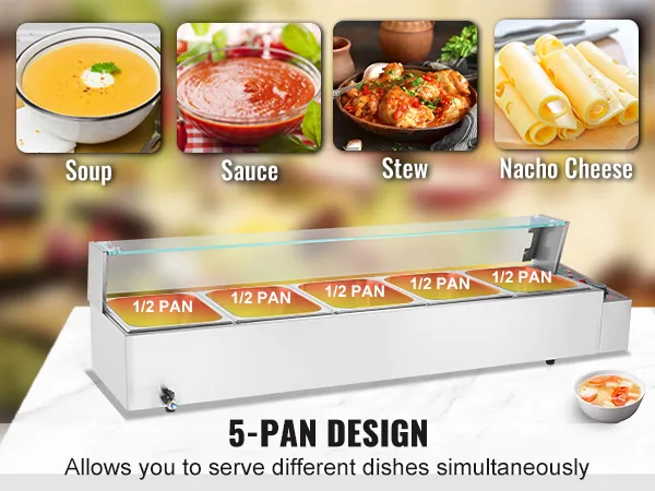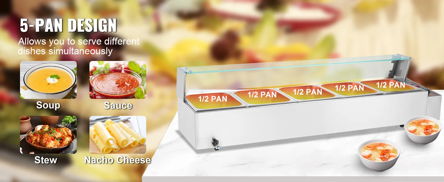 Flexible Combination: The buffet bain marie includes five 1/2-size pans with a standard 5.9-inch (15 cm) depth, compatible with all 5.9-inch deep compartments. Freely change your menu, from soups and sauces to stews and nacho cheese