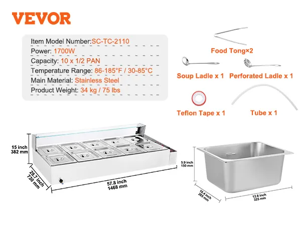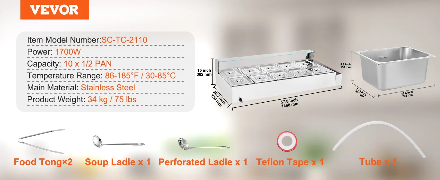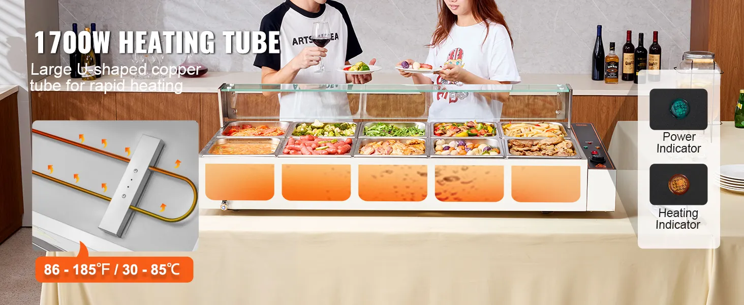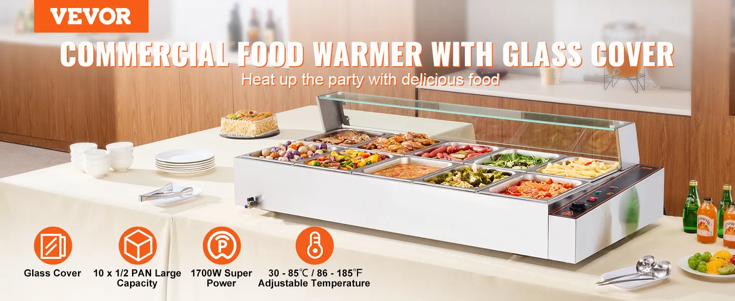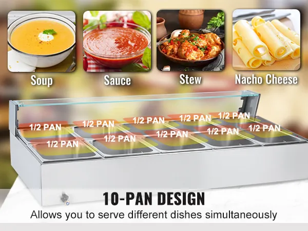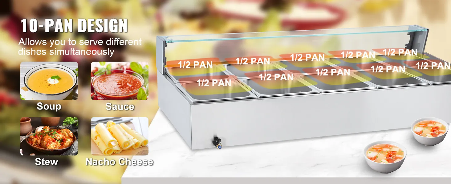 Includes 10 Pans: Our commercial food warmer comes with ten 8QT food pans (10*1/2-Size) accompanied by their respective lids, allowing you to serve different dishes simultaneously. Feel free to change up your menu from soups and sauces to stew, or even nacho cheese and chocolate.