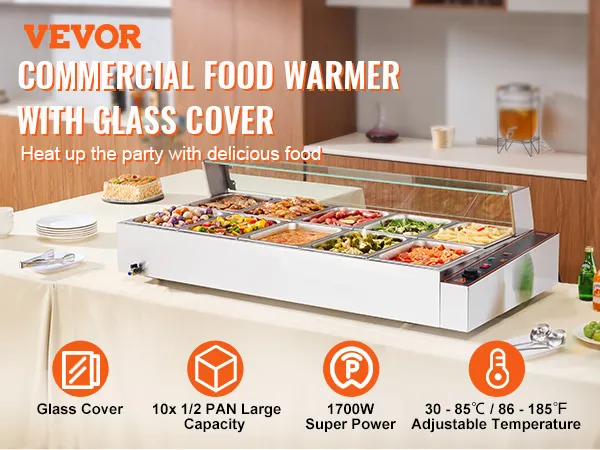 VEVOR 10-Pan Commercial Food Warmer, 10 x 8QT Electric Steam Table with Glass Cover, 1700W Countertop Stainless Steel Buffet Bain Marie 86-185°F Temp Control for Catering, Restaurants, Silver