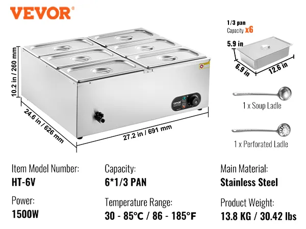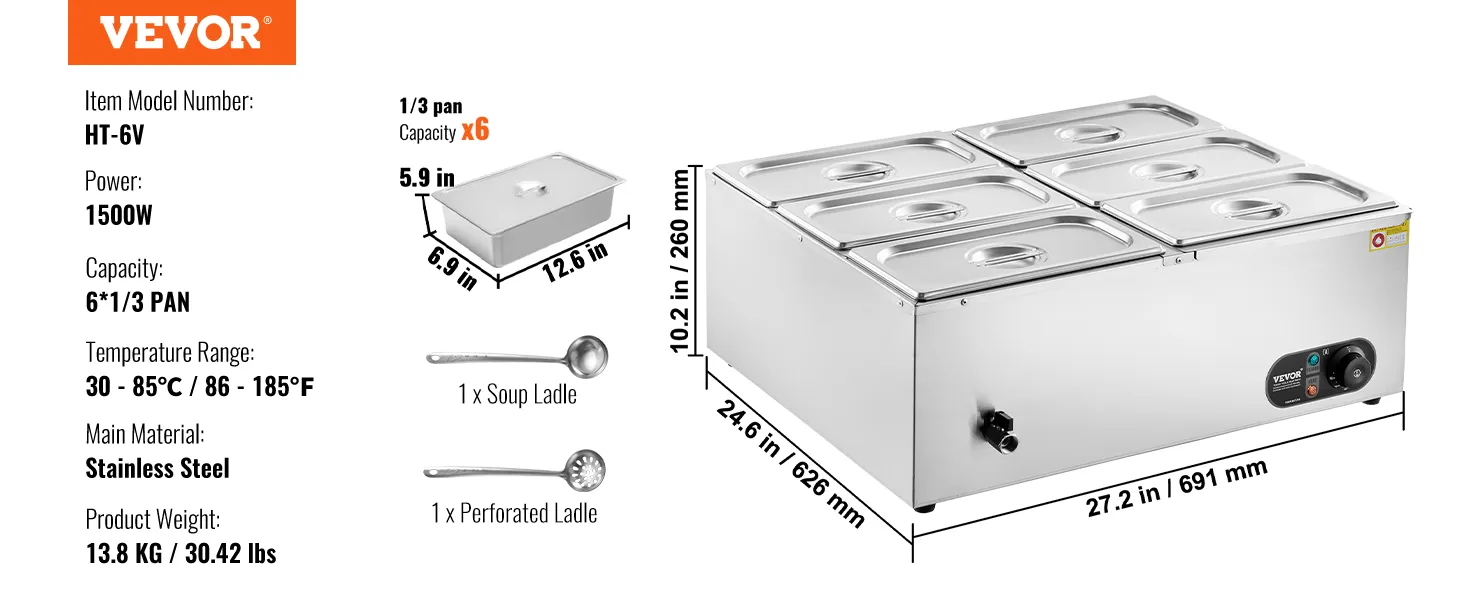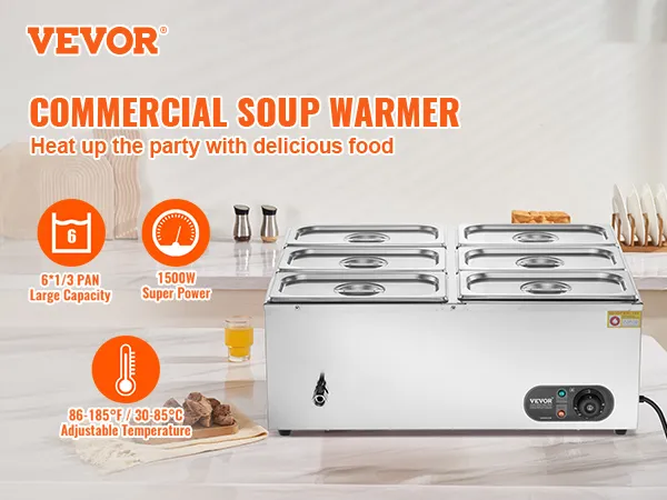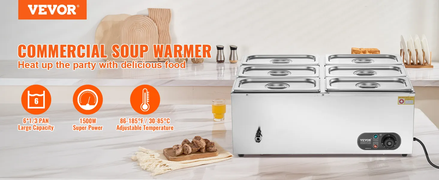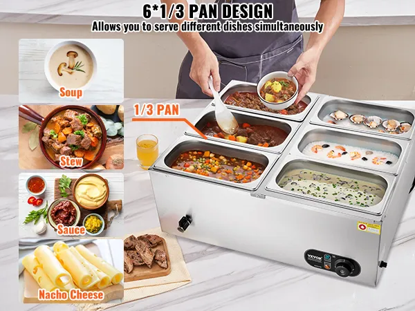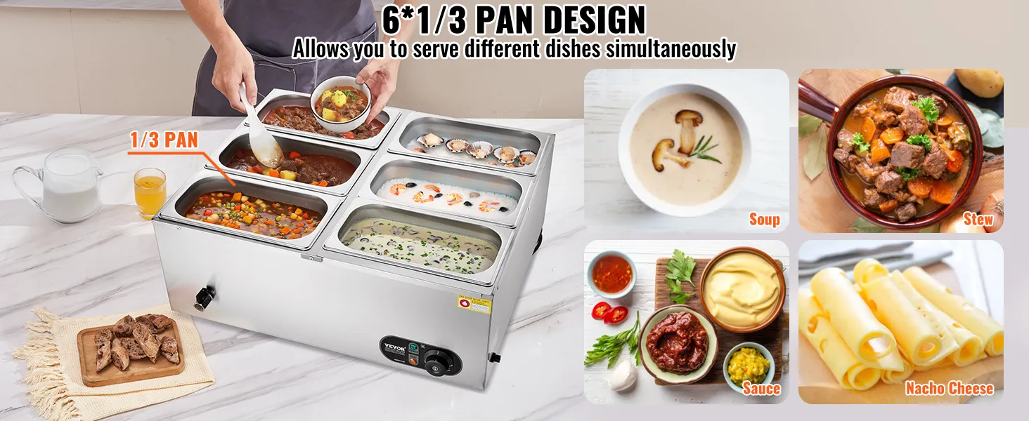 Includes 6 Pans: Our commercial food warmer comes with 6 x 5qt food pans accompanied by their respective lids, allowing you to serve different dishes simultaneously. Feel free to change up your menu from soups and sauces to stew, or even nacho cheese and chocolate.