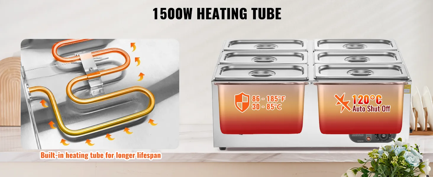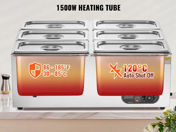 Fast Heating, Lasting Warmth: This impressive food warmer with pans comes with a powerful 1500-watt stainless steel heating tube that rapidly warms up your food to maintain its hot and delicious flavors. You can adjust the temperature output to suit your preference, ranging from 86 - 185℉ / 30 - 85℃, thanks to the temperature controller.