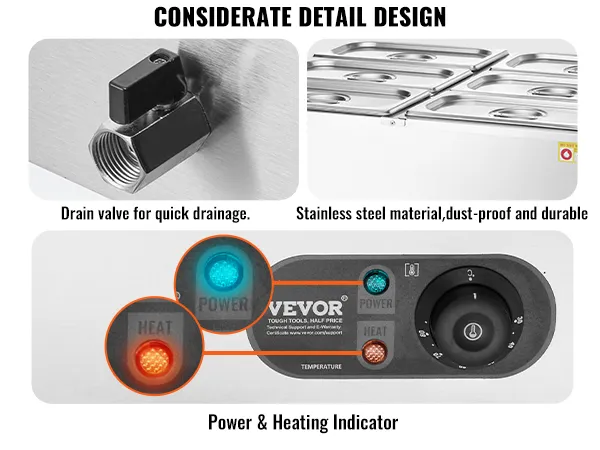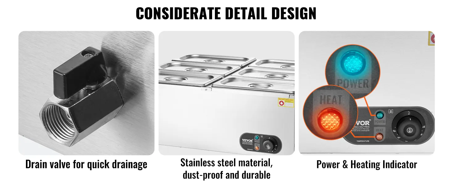 Robust Stainless Steel Build: This food warmer is built to last, with a sturdy all-stainless steel construction that can withstand constant use, and is easy to clean and maintain. The well has a thickened wall (0.03" / 0.8 mm thick) that provides additional sturdiness and has a secure water seal.