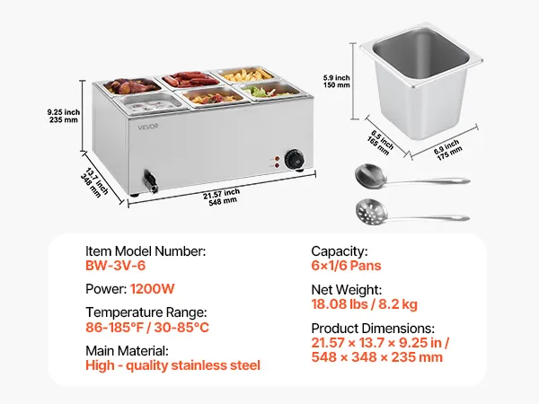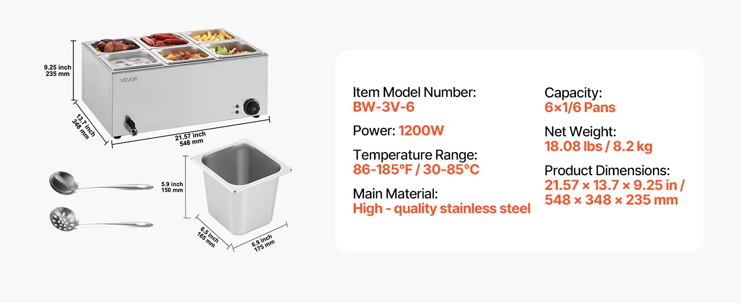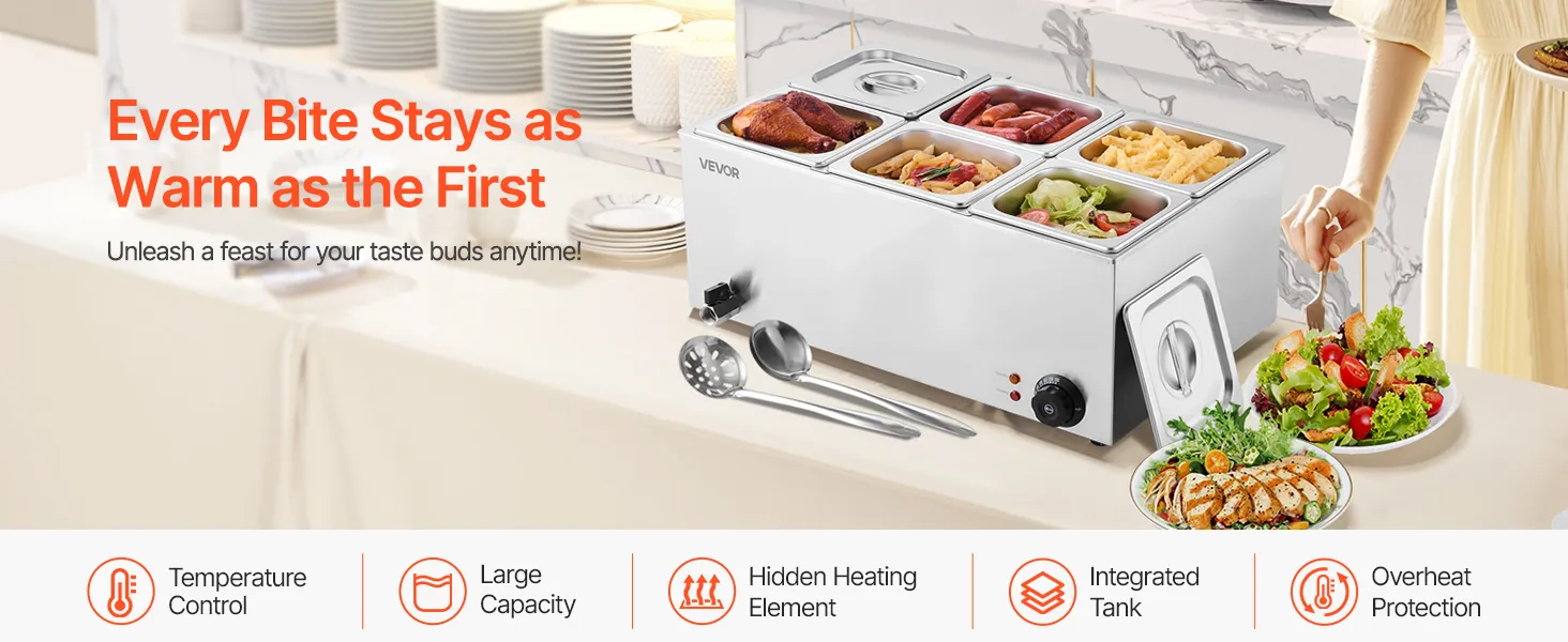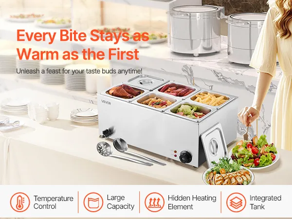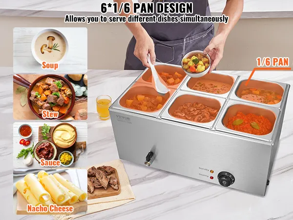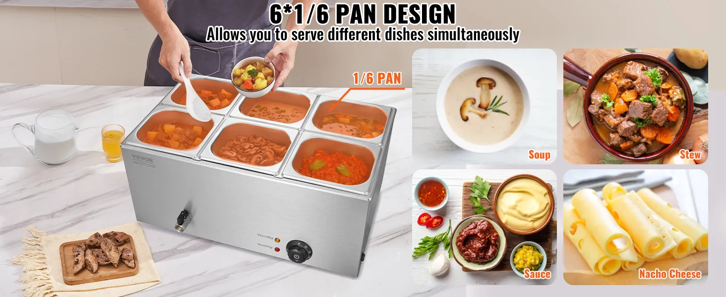 Flexible Combination: The buffet bain marie includes six 1/6-size pans with a standard 5.9-inch (15 cm) depth, compatible with all 5.9-inch deep compartments. Freely change your menu, from soups and sauces to stews and nacho cheese