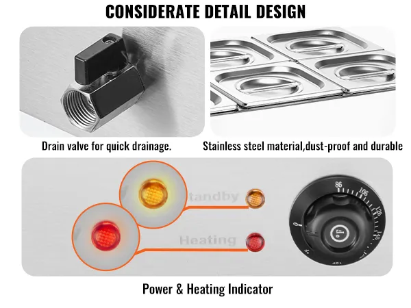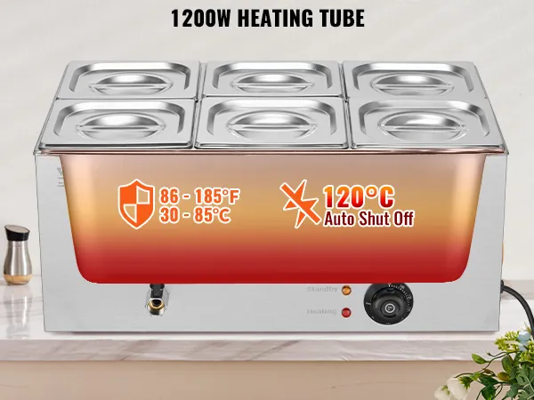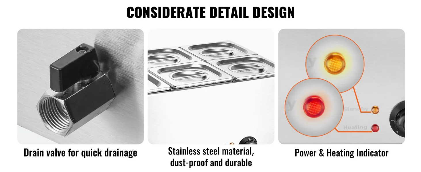 Equipped with a 1200W hidden heating tube, the buffet bain marie heats quickly and prevents scale buildup. Temperature adjustable from 86-185°F (30-85°C), with dual-color temperature indicators and auto shut-off when overheating. 3-step restart, but DO NOT add ice water to prevent damage.