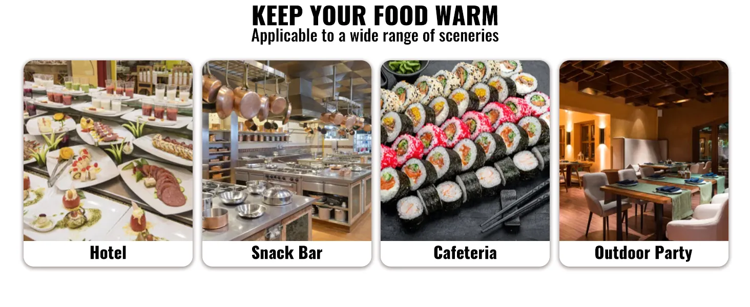 This commercial food warmer is your perfect food guardian, keeping dishes warm at family gatherings or parties. It ensures your food stays perfectly warm and ready to delight your taste buds at any time, creating an unforgettable dining experience.