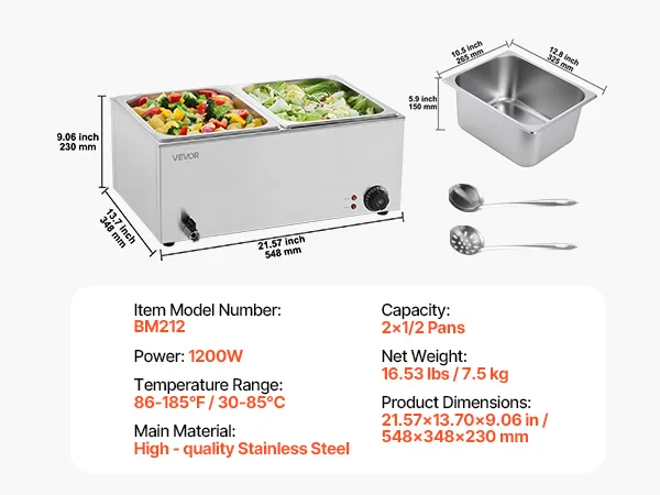 VEVOR Commercial Food Warmer, 2-Pan Electric Steam Table, 1200W Professional Countertop Stainless Steel Buffet Bain Marie with 86-185°F Temp Control for Catering, Buffet, Parties, Restaurants