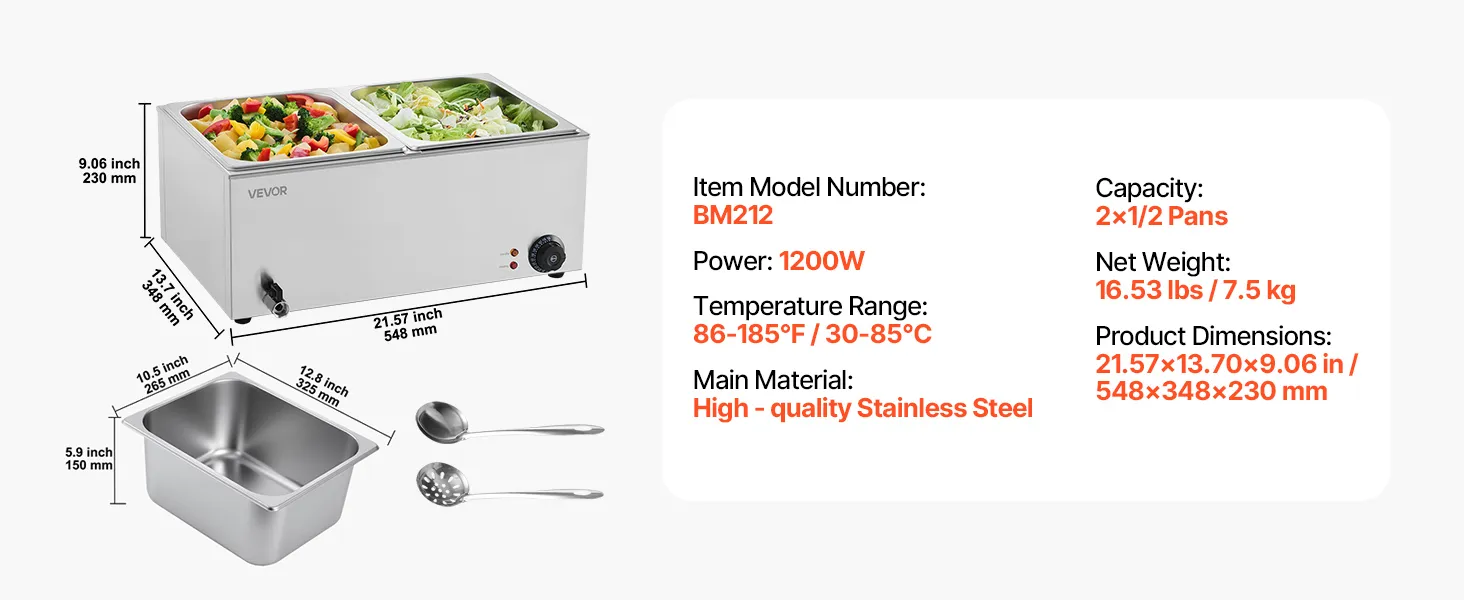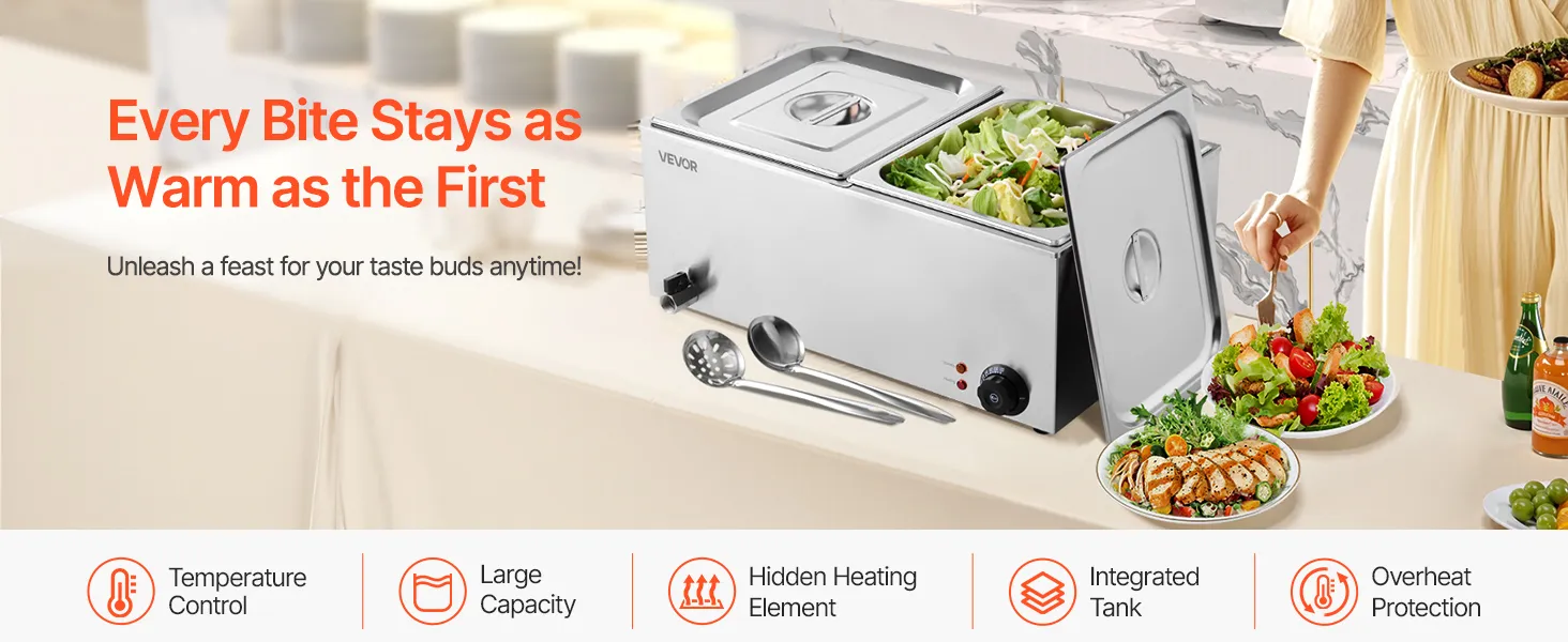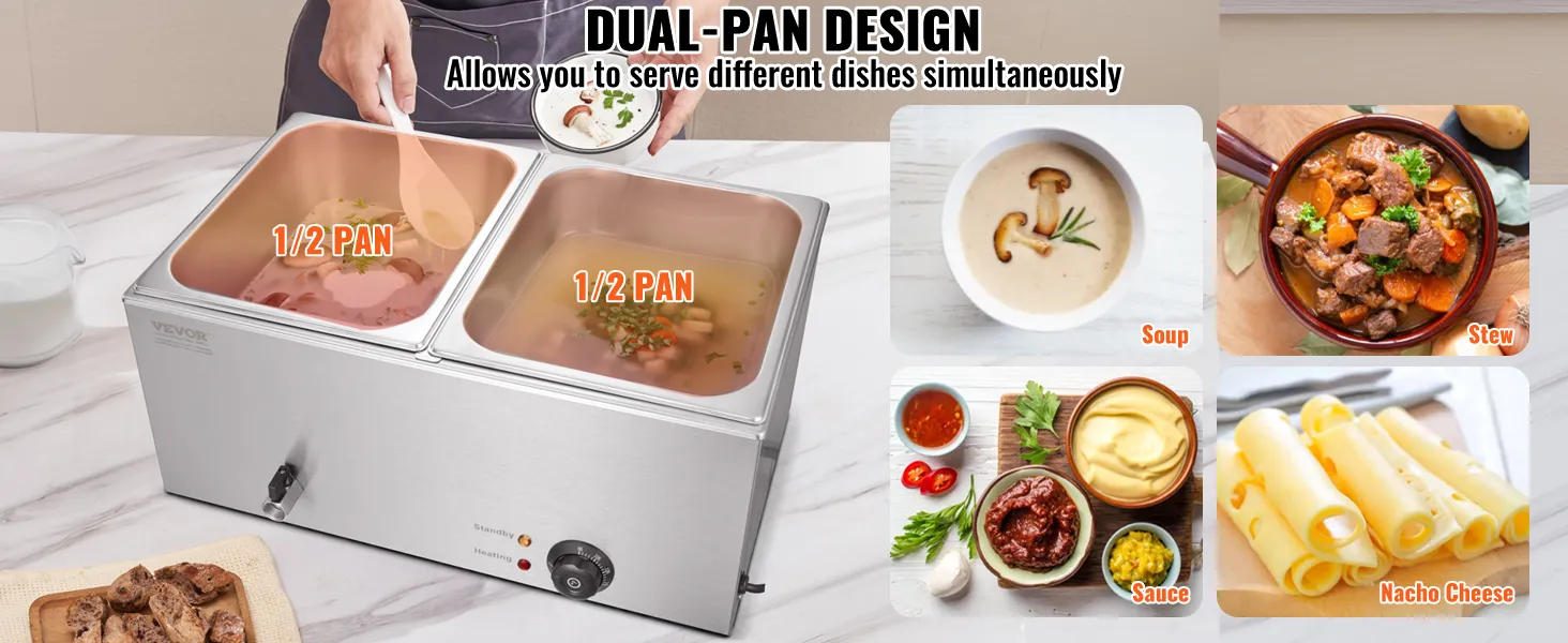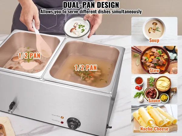 Flexible Combination: The buffet bain marie includes two 1/2-size pans with a standard 5.9-inch (15 cm) depth, compatible with all 5.9-inch deep compartments. Freely change your menu, from soups and sauces to stews and nacho cheese