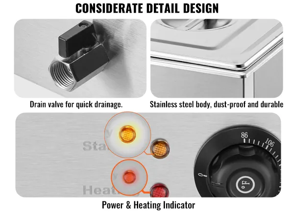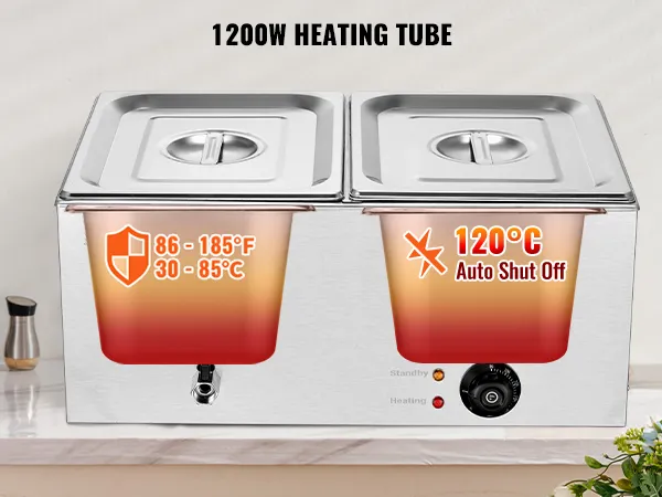 Equipped with a 1200W hidden heating tube, the buffet bain marie heats quickly and prevents scale buildup. Temperature adjustable from 86-185°F (30-85°C), with dual-color temperature indicators and auto shut-off when overheating. 3-step restart, but DO NOT add ice water to prevent damage.