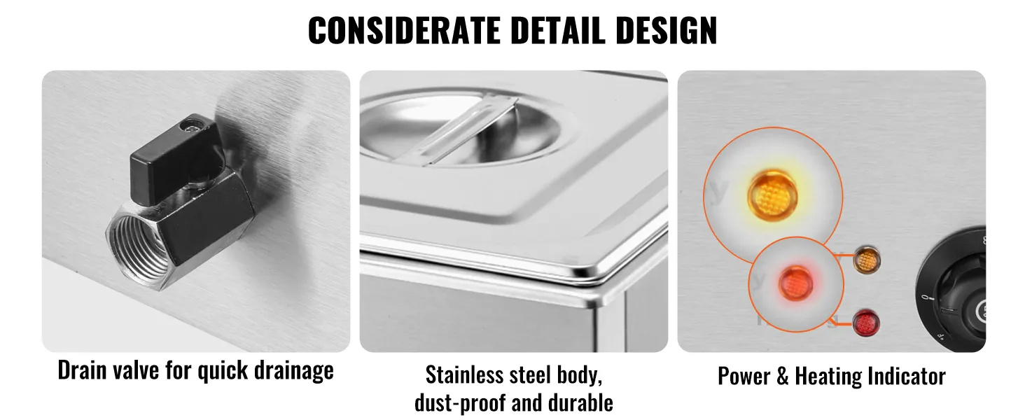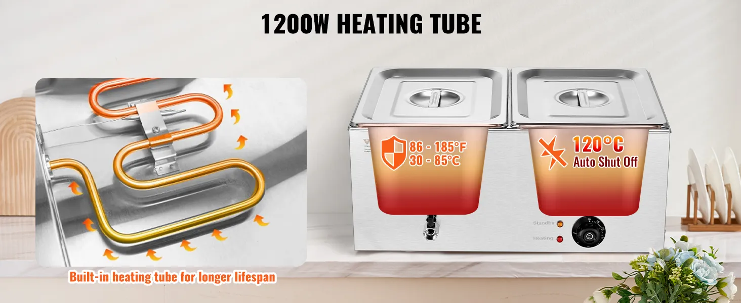 Fast Heating, Lasting Warmth: With a 1200W stainless steel heating tube, this commercial food warmer heats quickly to keep food at the perfect temperature and flavor. Adjustable temperature range: 86°F-185°F (30°C-85°C) to suit your preferences