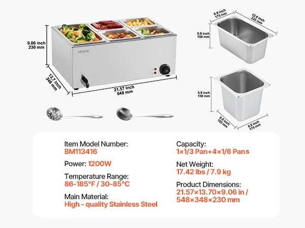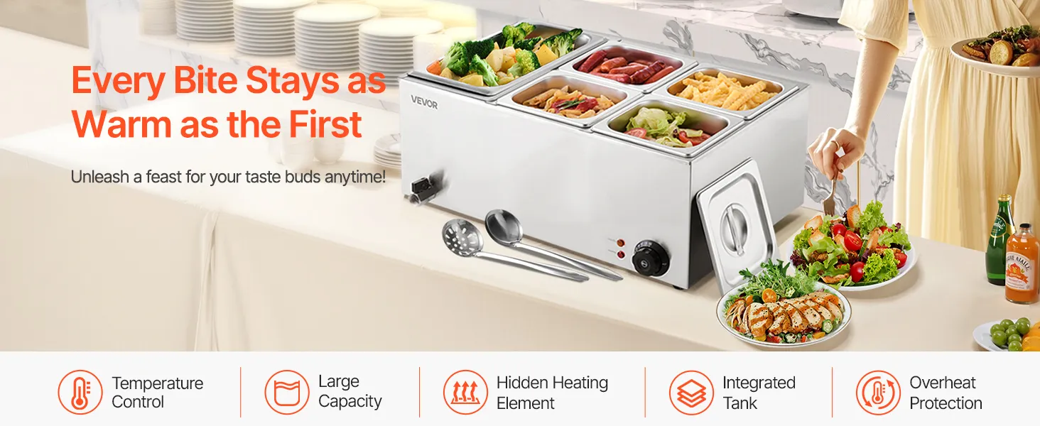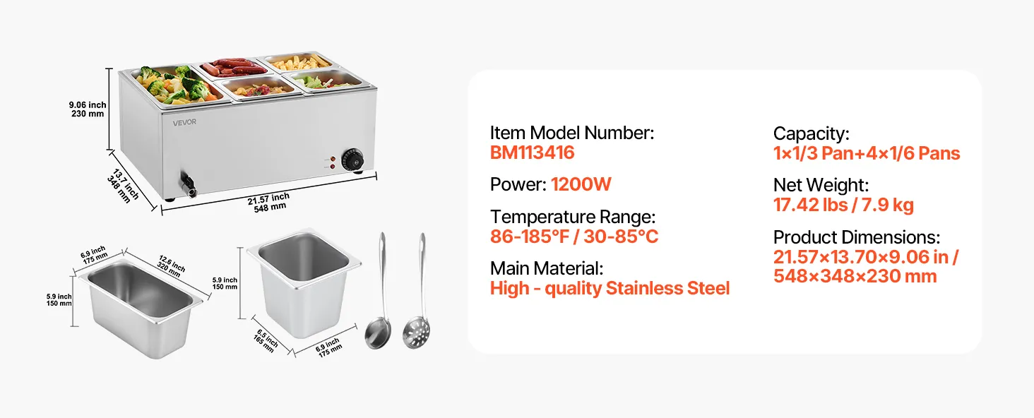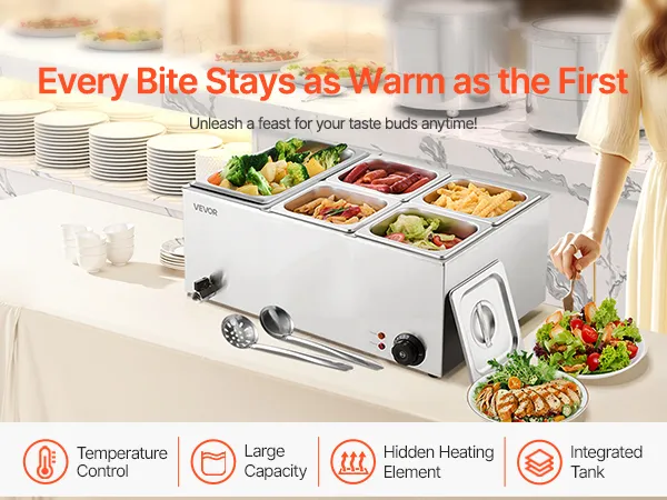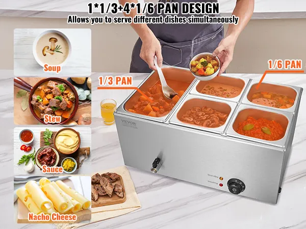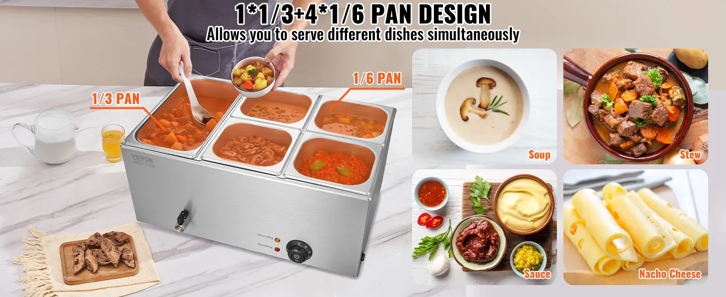Flexible Combination: The buffet bain marie includes one 1/3-size and four 1/6-size pans with a standard 5.9-inch (15 cm) depth, compatible with all 5.9-inch deep compartments. Freely change your menu, from soups and sauces to stews and nacho cheese