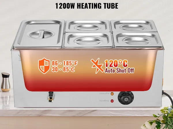 Fast Heating, Lasting Warmth: With a 1200W stainless steel heating tube, this commercial food warmer heats quickly to keep food at the perfect temperature and flavor. Adjustable temperature range: 86°F-185°F (30°C-85°C) to suit your preferences