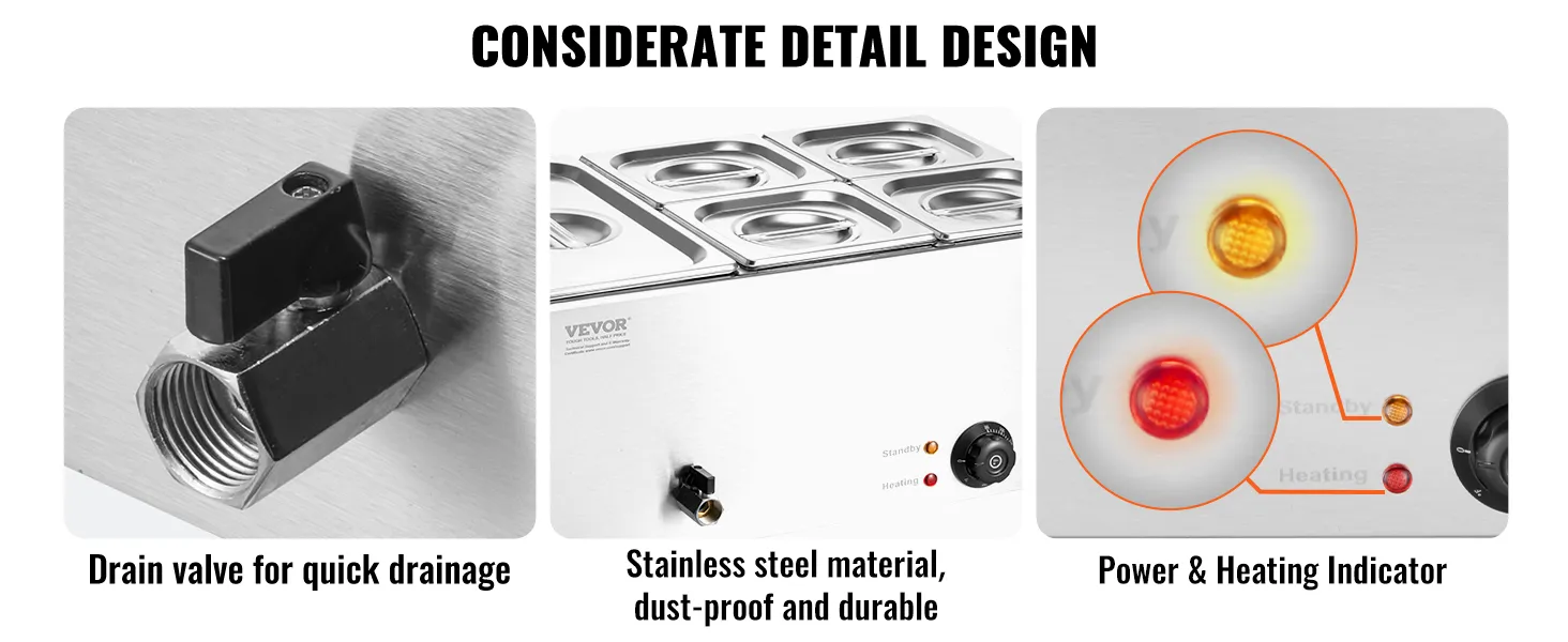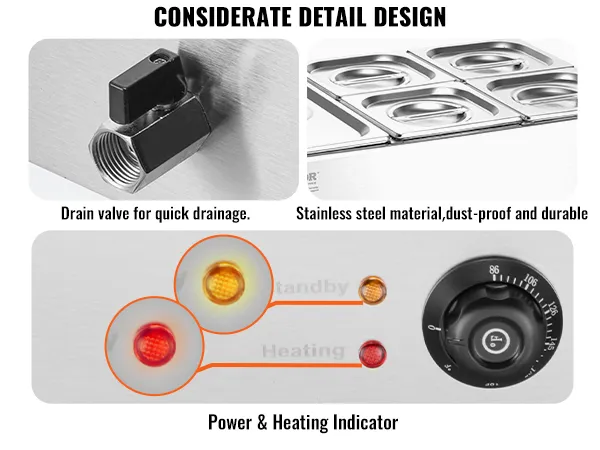 Equipped with a 1200W hidden heating tube, the buffet bain marie heats quickly and prevents scale buildup. Temperature adjustable from 86-185°F (30-85°C), with dual-color temperature indicators and auto shut-off when overheating. 3-step restart, but DO NOT add ice water to prevent damage.