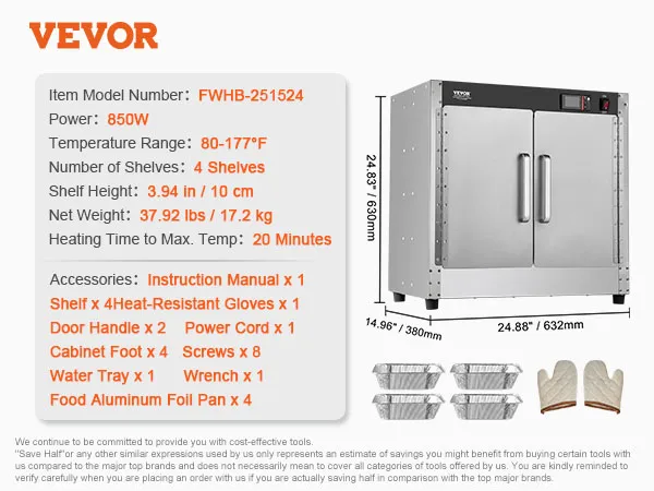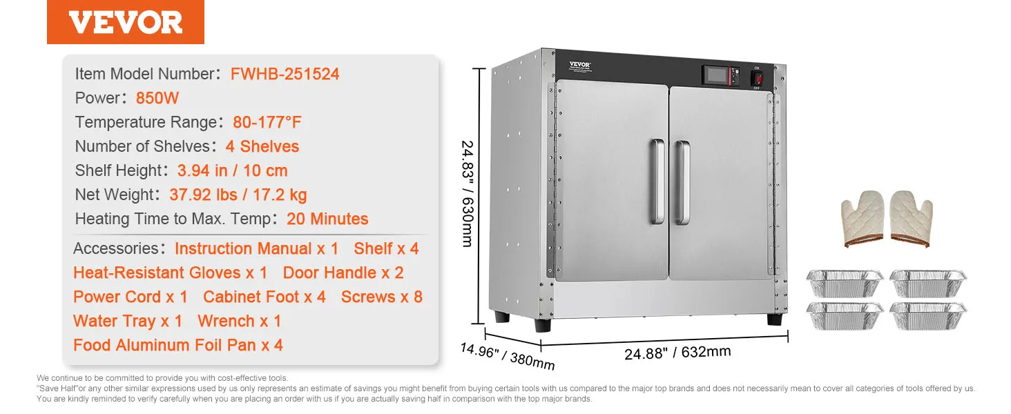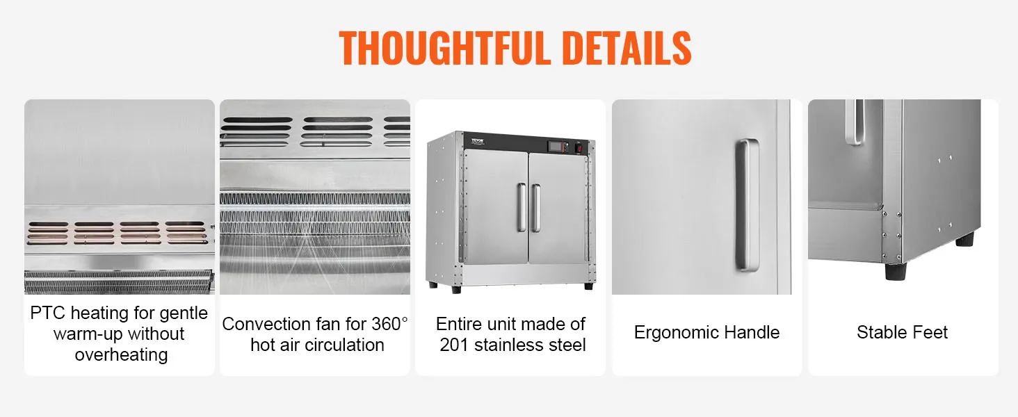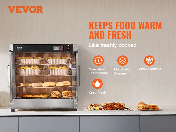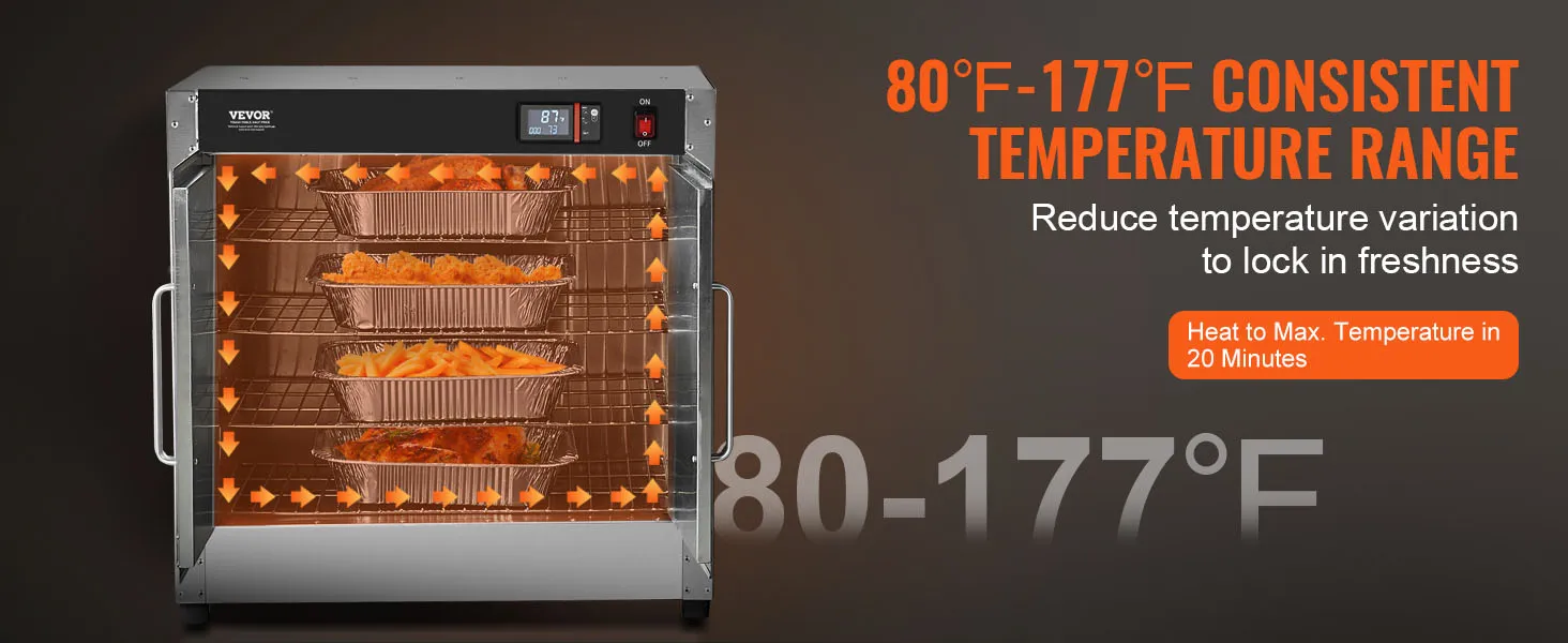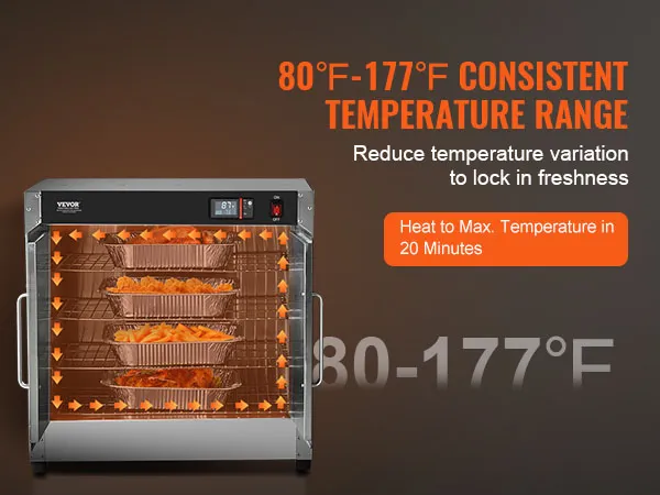 Langdurig warm houden: de commerciële voedselverwarmingskast heeft een instelbaar temperatuurbereik van 80℉ tot 177℉ (26 tot 80℃) met snelle verwarming en langdurige warmte. Real-time temperatuurbewaking en eenvoudige bediening maken het perfect voor het bewaren van heerlijk, sappig gekookt vlees, noedels, knapperig gefrituurd voedsel, gefermenteerde yoghurt en gedroogd fruit en groenten.