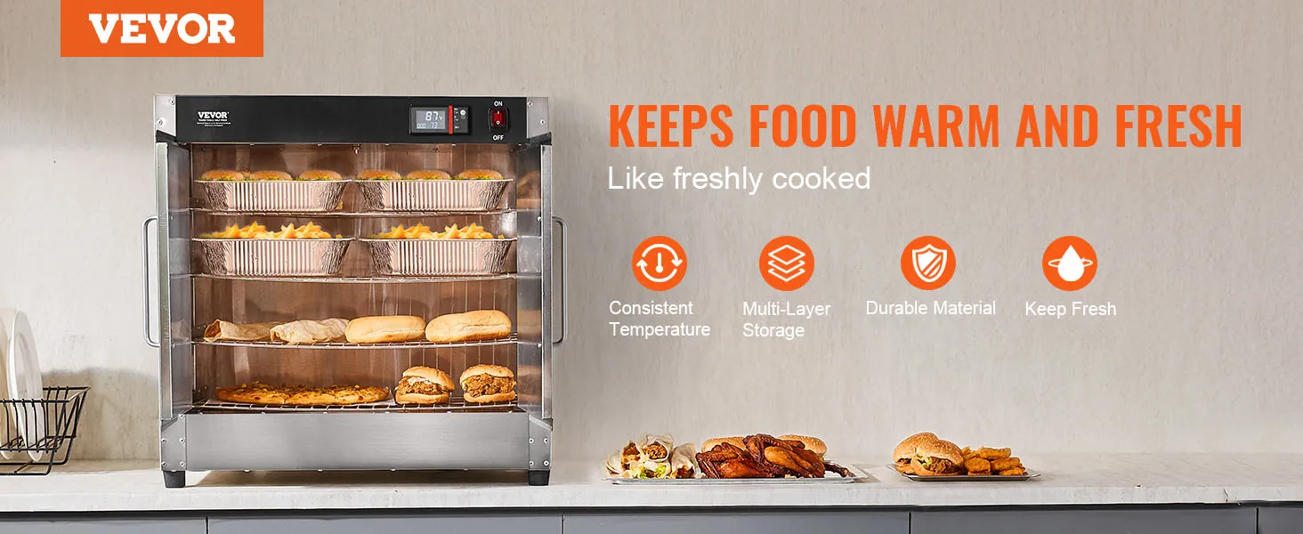 Veelzijdige toepassing: onze voedselverwarmer is geschikt voor verschillende omgevingen, waaronder restaurants, scholen, bedrijfskantines en foodtrucks. Het garandeert dat uw gasten genieten van gloeiend hete maaltijden en dompelt iedereen onder in een heerlijke culinaire ervaring.