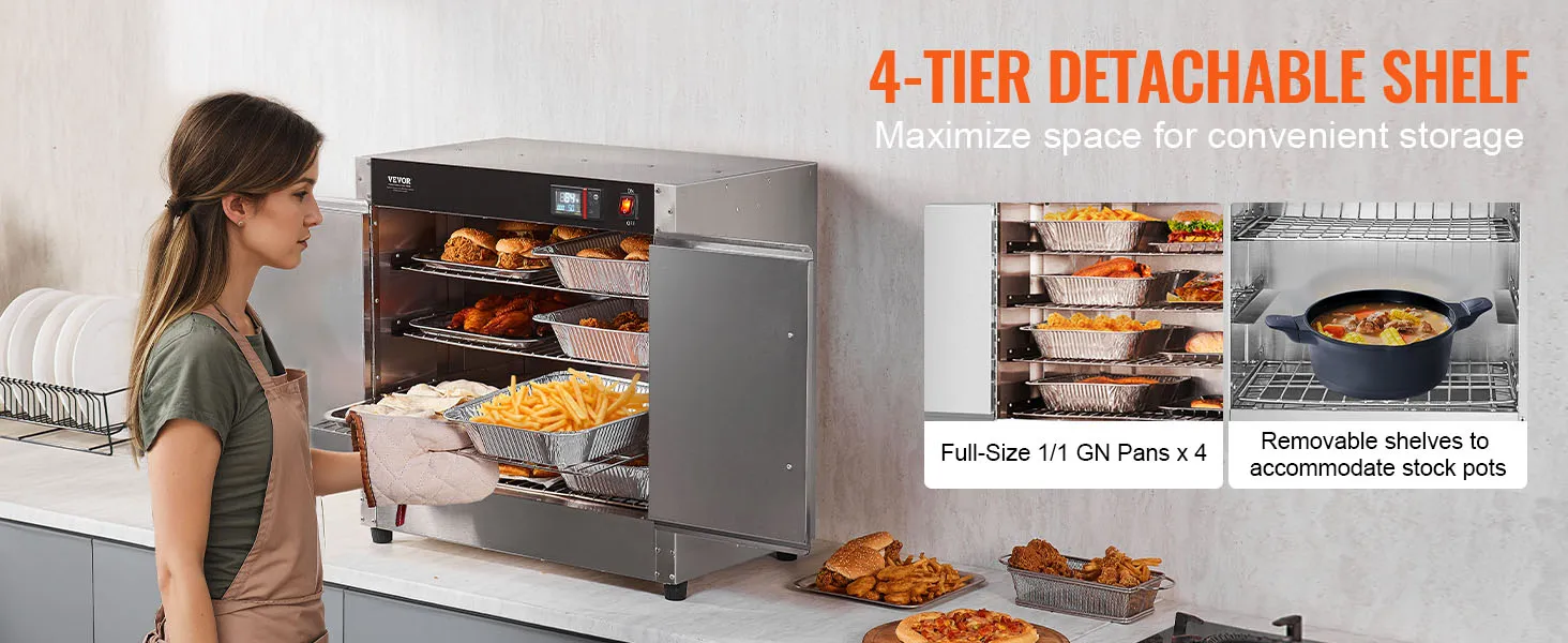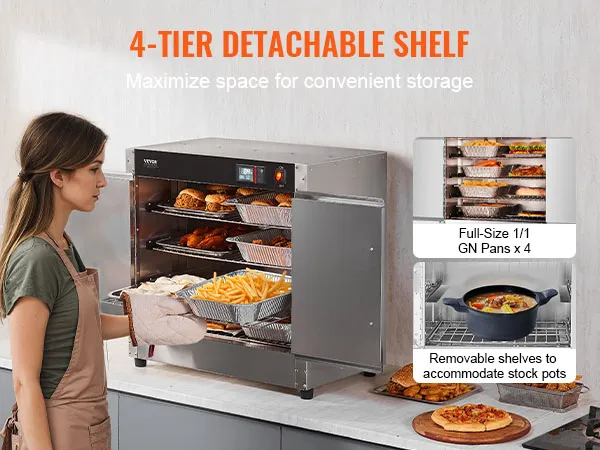 De voedselverwarmer heeft 4 uitneembare planken die stabieler zijn dan conventionele roosters. De in hoogte verstelbare en uitneembare planken maken het plaatsen van grotere gerechten eenvoudiger.